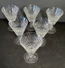 Each glass measures 5.25 inches, and has a vertical and crisscross cuts on a flared bowl with a center stem.