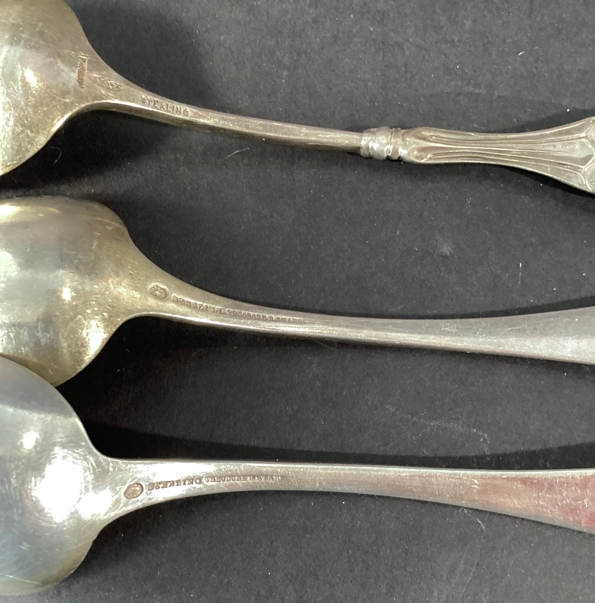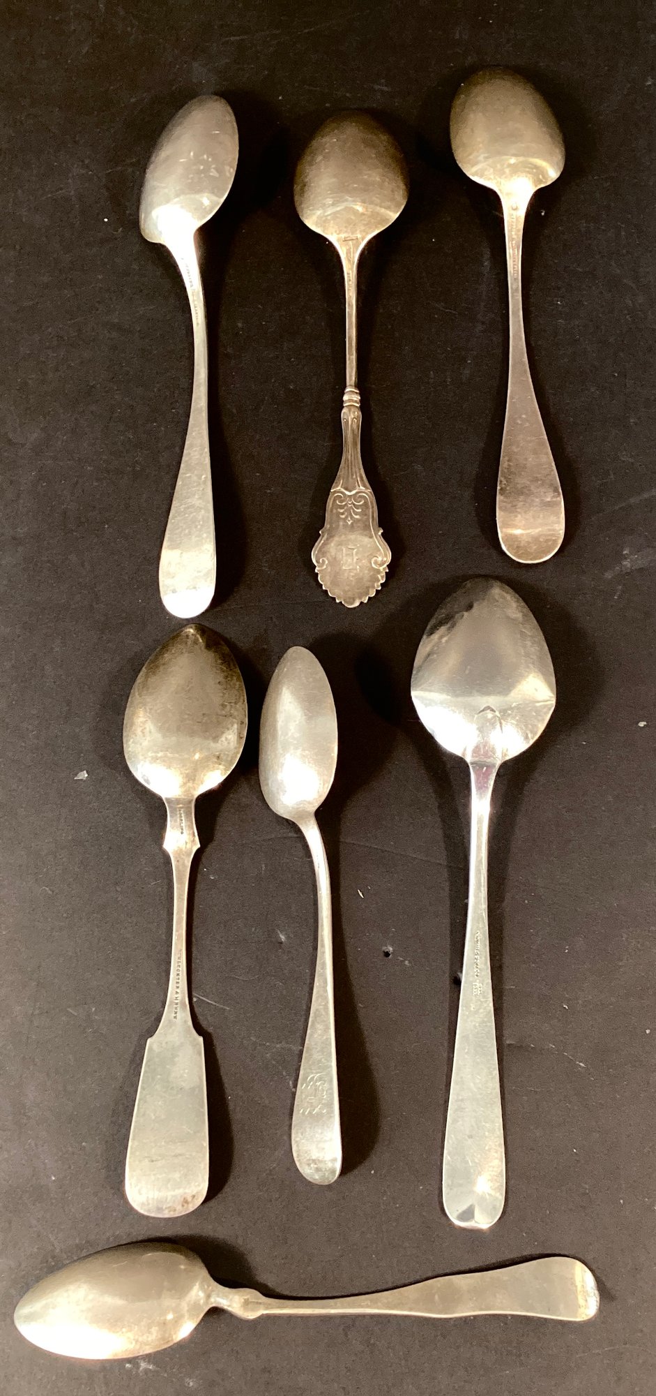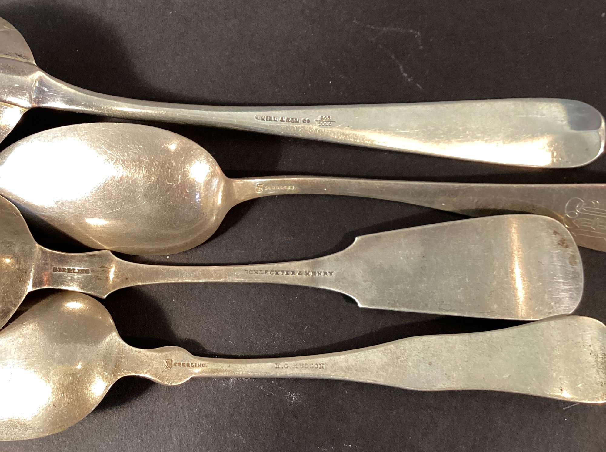 The spoons have different patterns and include maker marks including H.G. Hudson, Kirk & Son, Theodore Starr, and Schlecter & Henry.