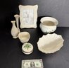 in this lot, we have seven different pieces of Lennox porcelain. The first is a nice oblong shell bowl, picture frame, cash pot, two bud vases, a Christmas covered box, and a small serving bowl.