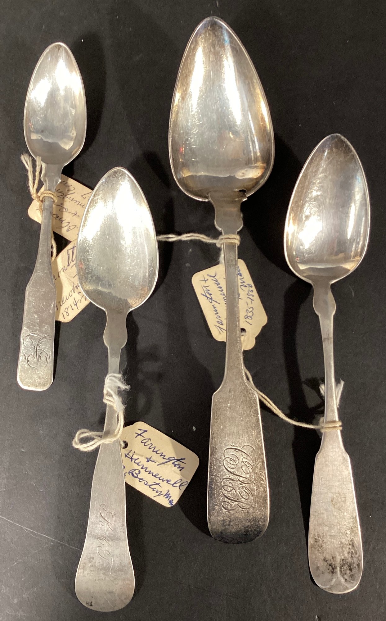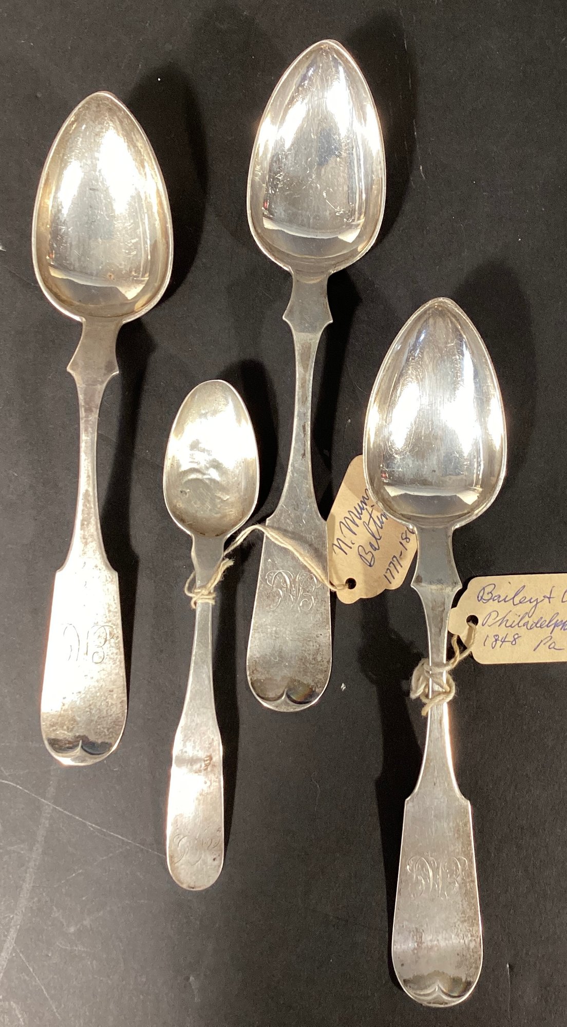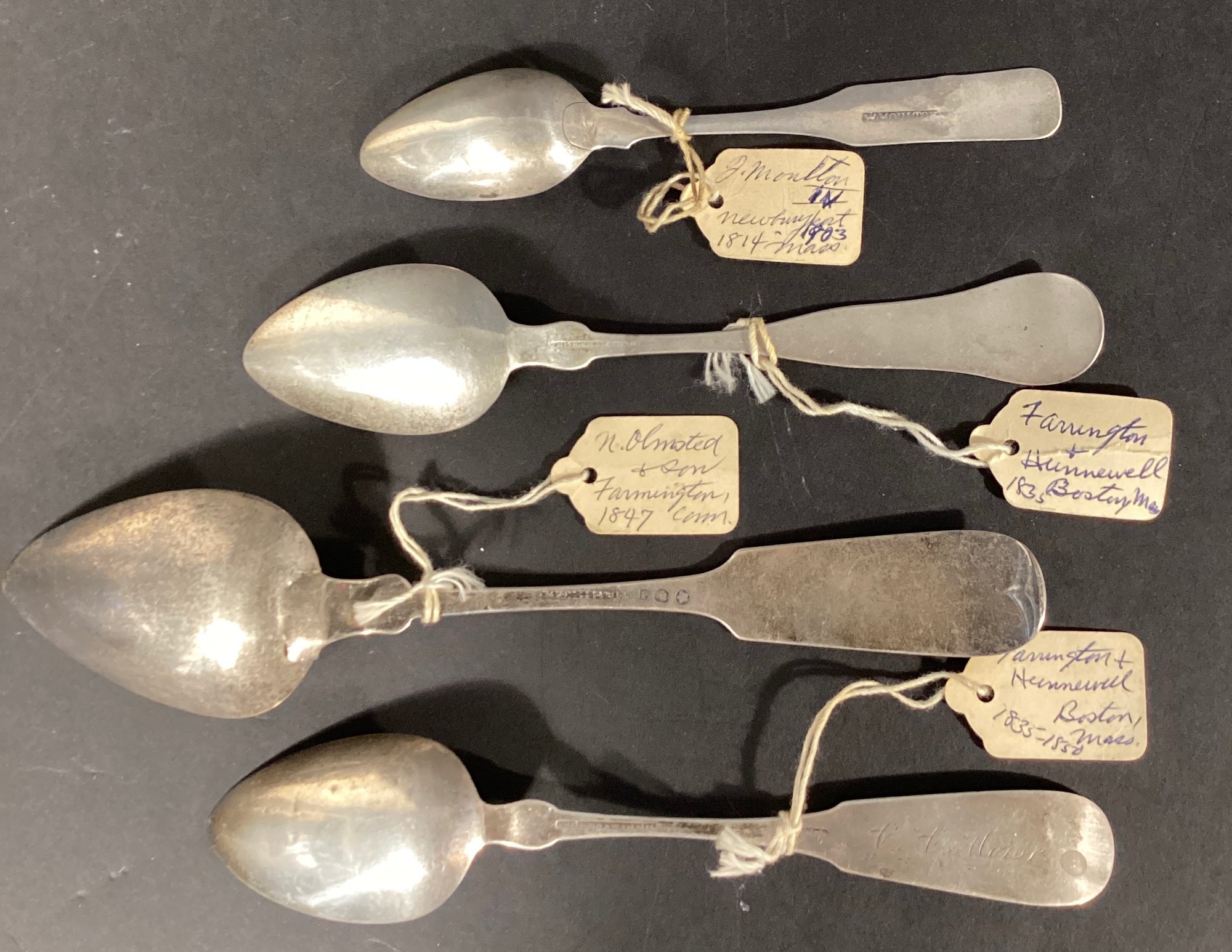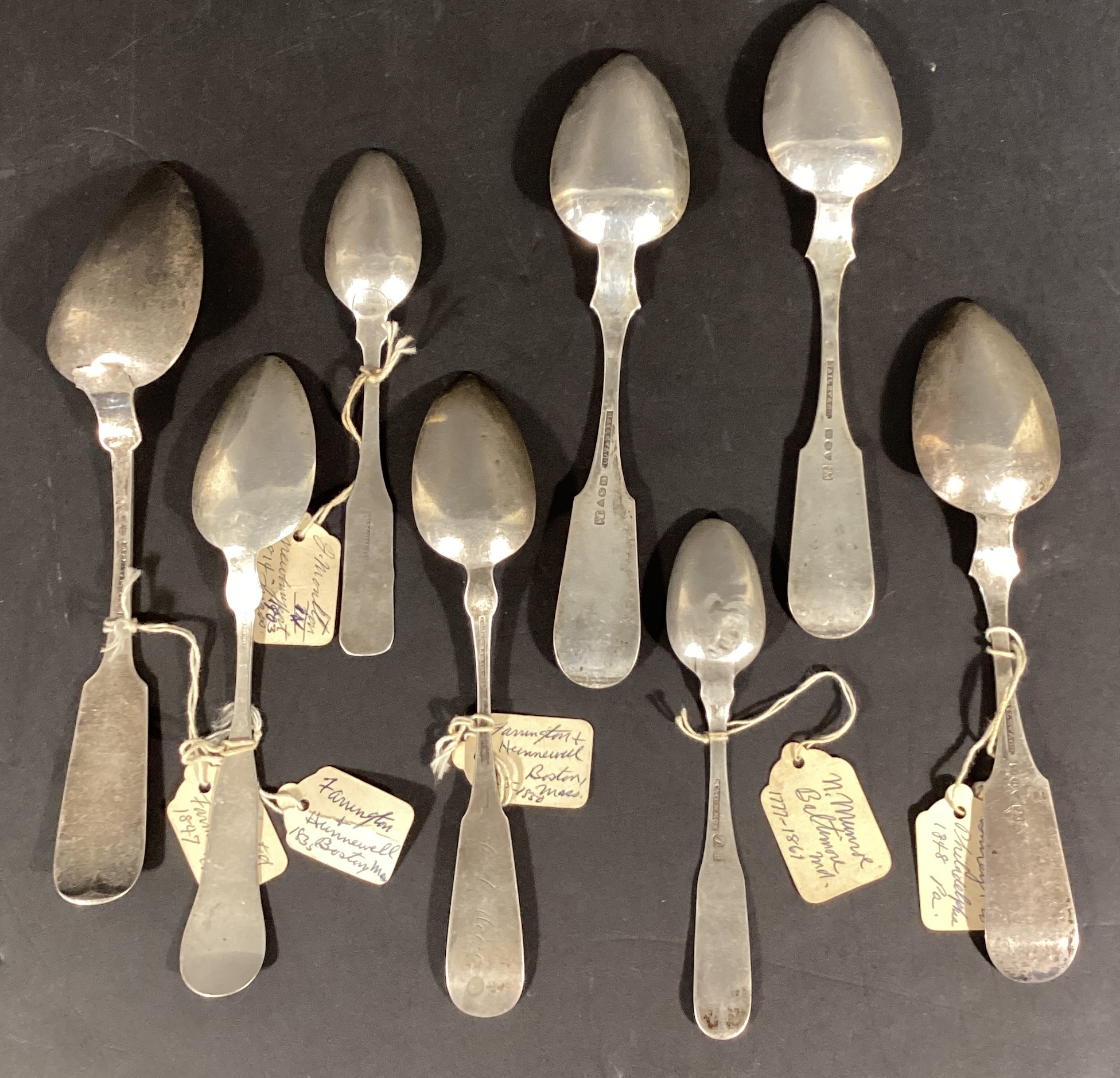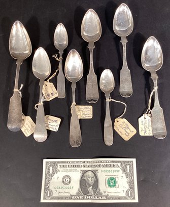The spoons are from good to excellent condition, and hail from such places as Baltimore, Maryland, Philadelphia from the 1850s, Boston, Massachusetts mid 1850s, Newburyport Massachusetts from 1814, Boston, Massachusetts from 1835 and Farmington, Connecticut 1847.