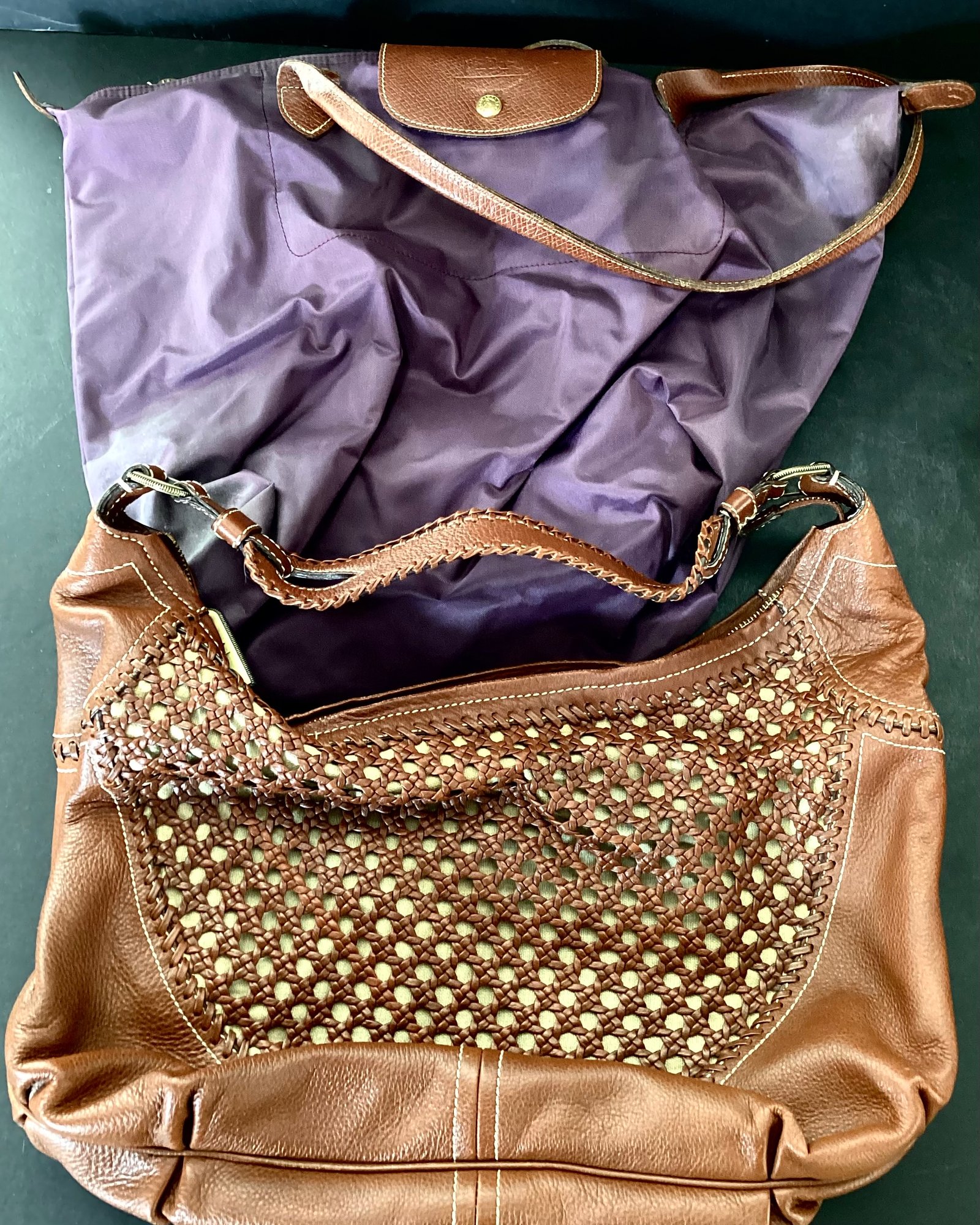 * the seventh handbag has been made in waterproof plum material, by the Longchamp company with leather handles. This bag measures approximately