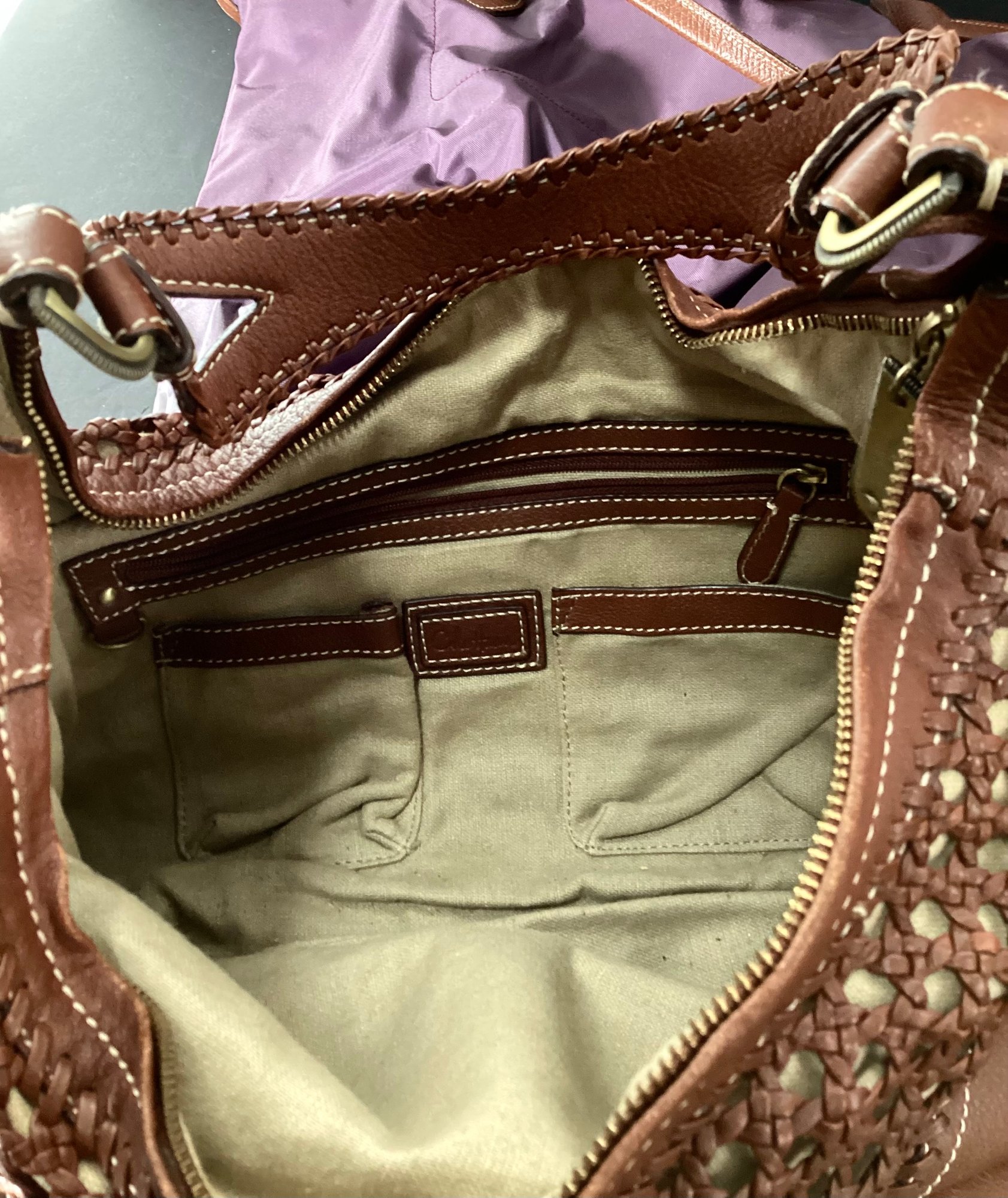 *the eighth handbag is Cole Haan hobo bag with a woven handle. This is a great handbag with a clean interior, and has a woven design not unlike the design of woven caning It has a clean beige cotton material interior, and many pockets within the bag. This measures 16” x 10”.