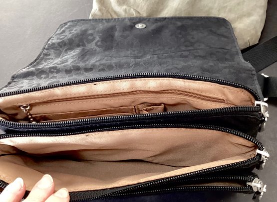 this handbag has three zipper levels within the bag, and a magnetic closure. A black material shoulder strap complete the look, and measures 9” x 6.5”.