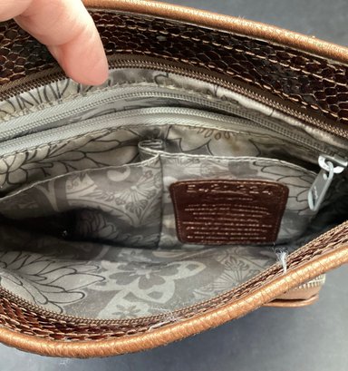 * a faux reptile handbag with faux leather straps. This is a very clean interior hand bag throughout, and is made by Brighton collection. The bag is 10” x 10” and it is noted that a few of the faux scales are missing.