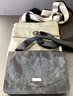 * the fourth handbag is a charcoal matte mesh bag with a gray satin interior. This has been made by the Armani exchange and has a zipper interior, with a magnetized closure.thos purse has curved white metal handles and measures approximately 8” x 8”.