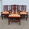 2 arms & 6 side chairs, 8 in all solid mahogany dining chairs that were probably recovered in the 1990’s with a very nice stylish silk blend fabric. Excellent detailed carving. Chair are made of solid mahogany no veneer. Original cost $650 each
