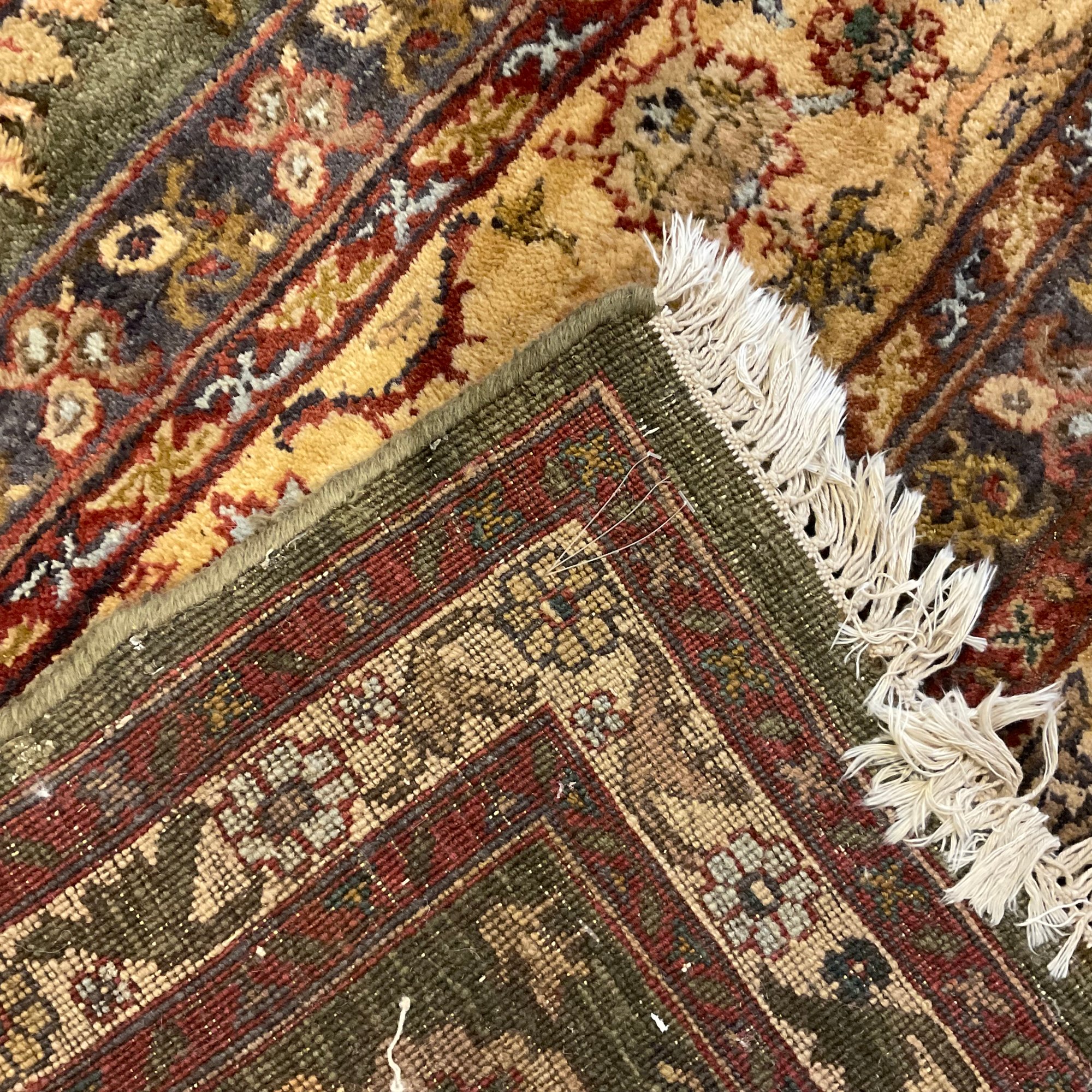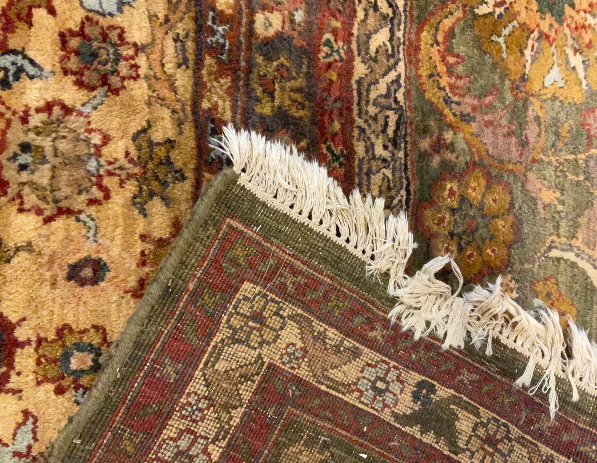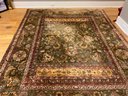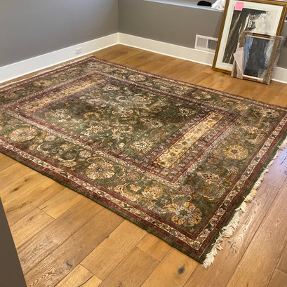 Contemporary wool hand made wool carpet. Very pleasing palette with a light green field and subtle complementary colors in the borders. Very strong design. Thick lustrous wool pile Condition is excellent, it could use a cleaning.