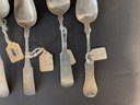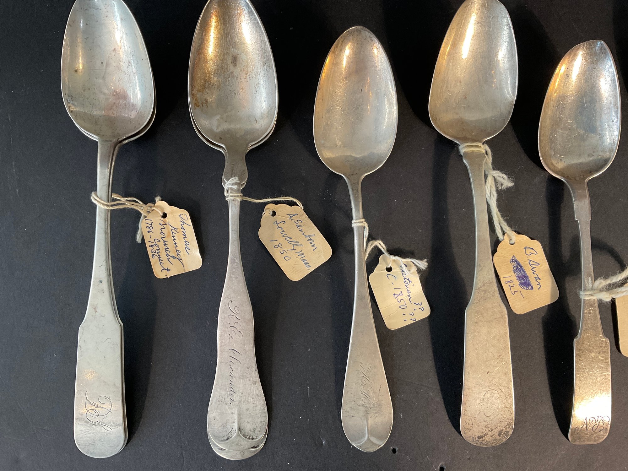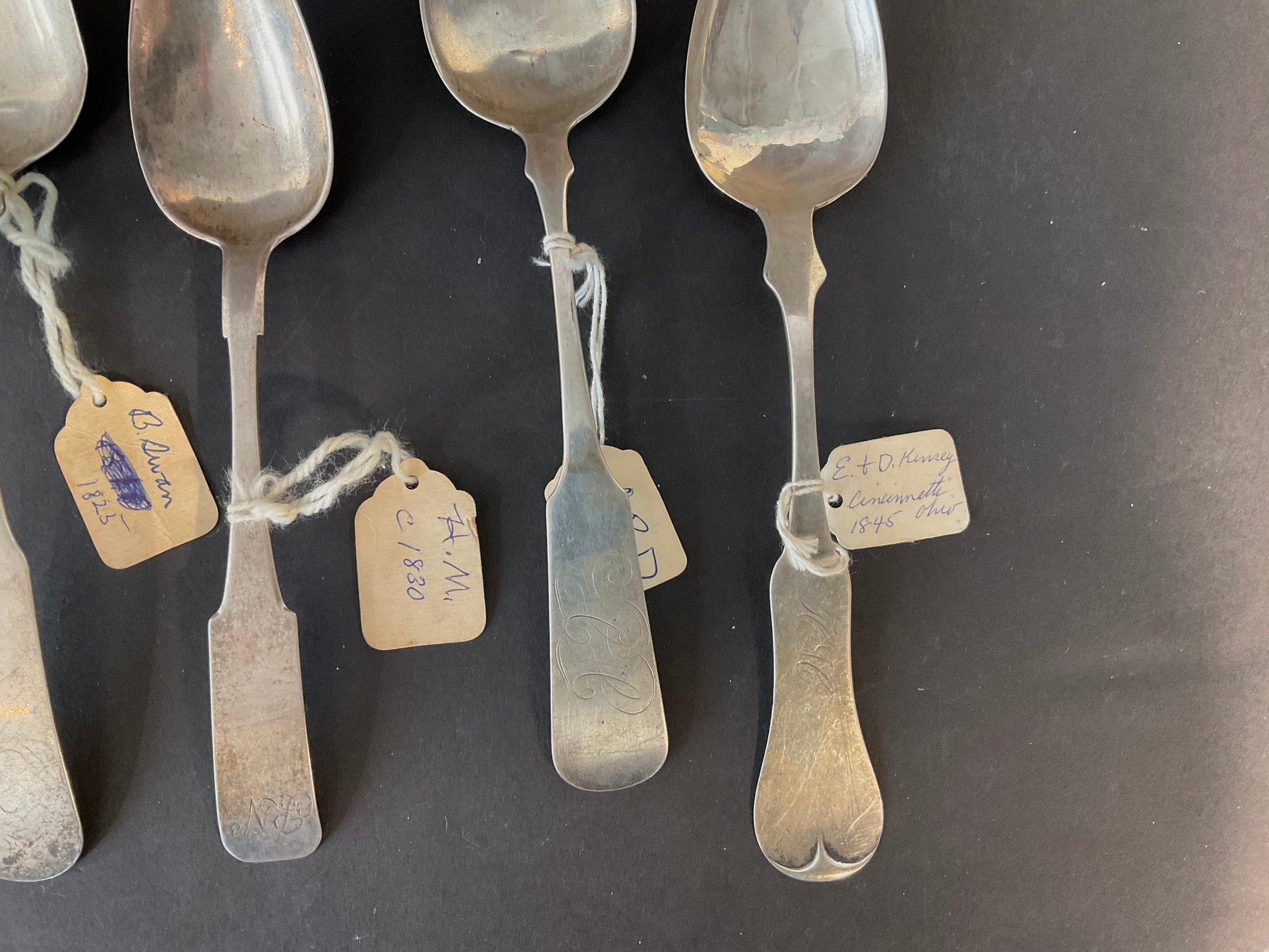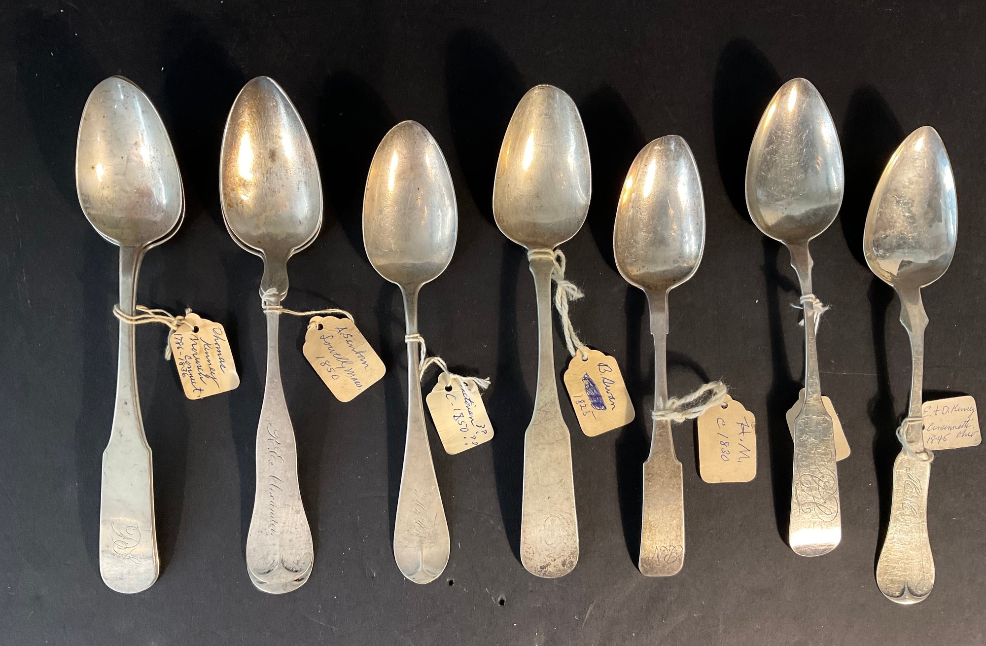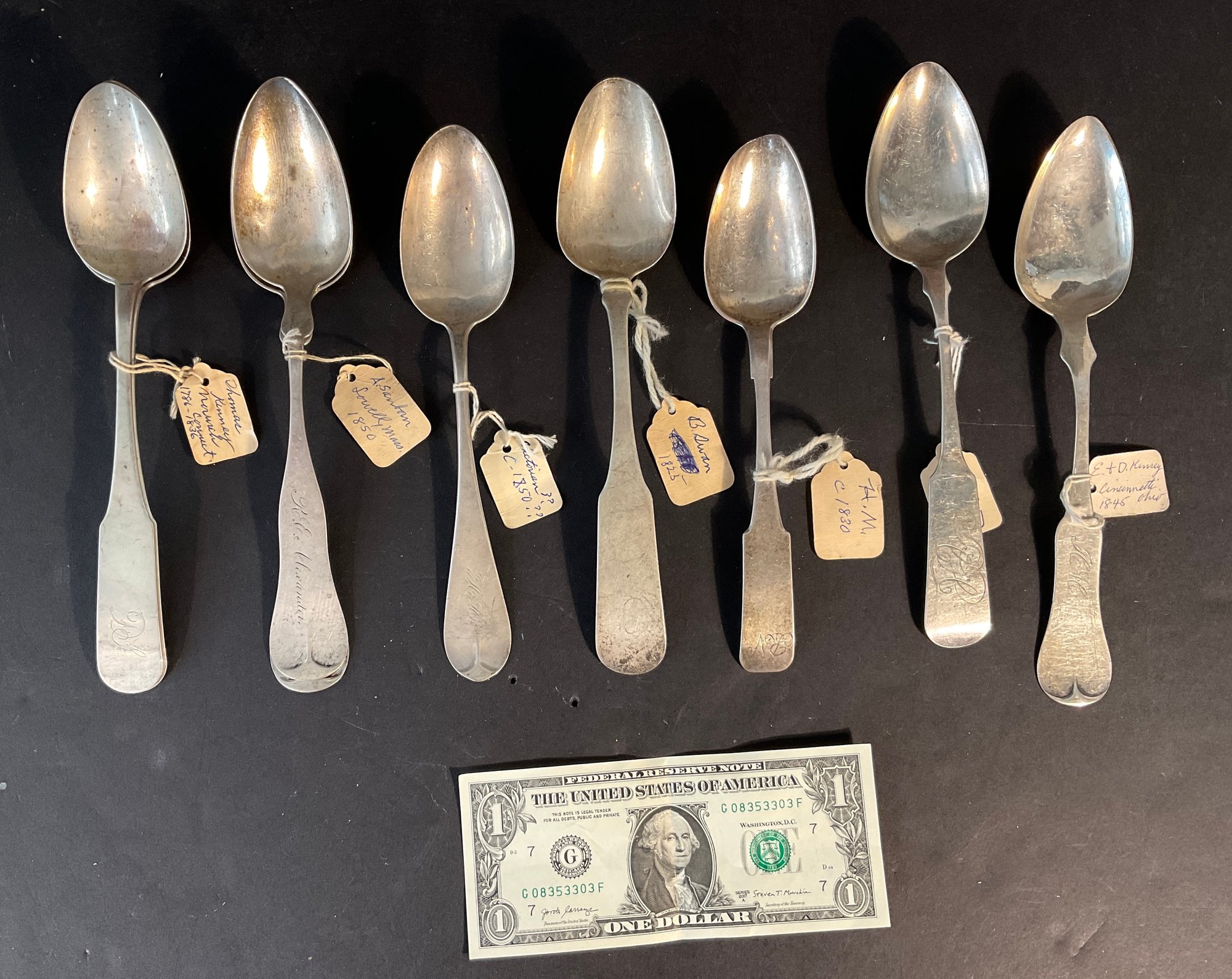 Mack, selling, nine authentic American antique coin, silver serving spoons. Most of them are New England, Norwich, Connecticut, Lowell Massachusetts, Cincinnati, Ohio. Most have monograms. One bowl on one spoon is worn. Other than that they seem to be in good condition. Circa 1820 - 1855