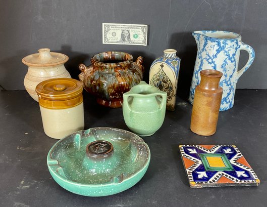 This lot consists of: A signed spongeware pitcher signed by EUGENE NEFF CROCKSVILLE OHIO, There is a small majollica double handled vase, California art pottery cigar ashtray marked “THE HYDE PARK “ # 1900, A small arts and crafts mottled Pottery vase, and Miscellaneous crockery.