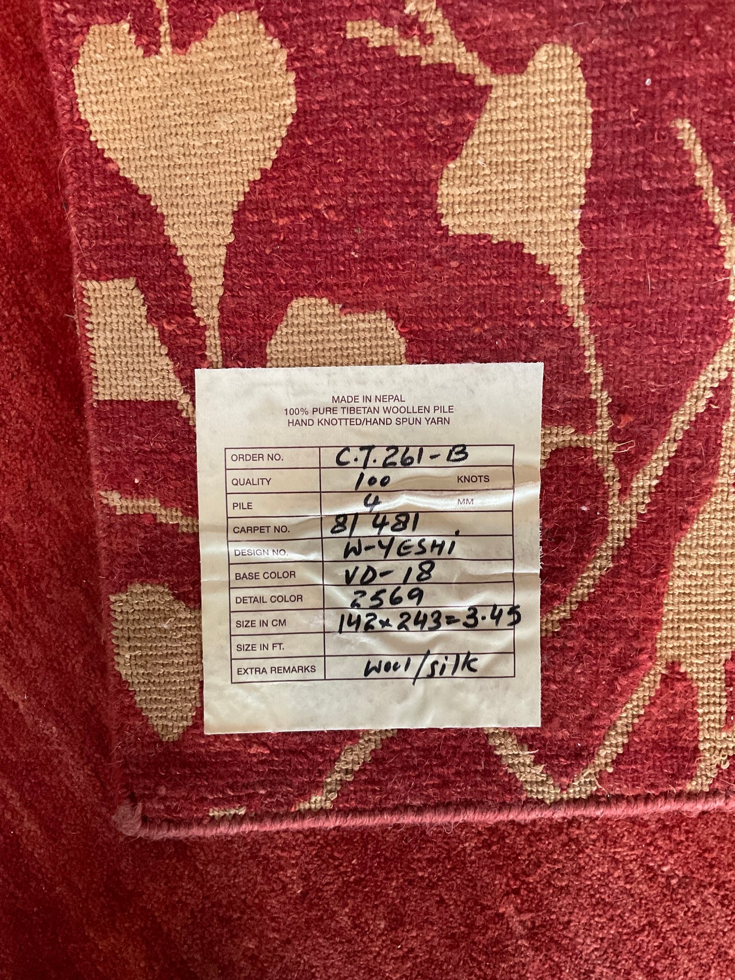 This vintage Yeshi carpet was made in the Napal with hand, dyed wool and silk . The rich brick, red tones and the saffron yellow floral sprigs, contributes to the high desirability for this type of carpet. Excellent quality with a label.