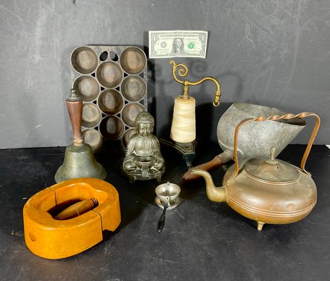 Extremely hard to find Griswold cast-iron number 5 muffin, copper, teapot, incense, burner, country, store, string holder, hat, band, scratcher, antique green scoop, and 5” school bill