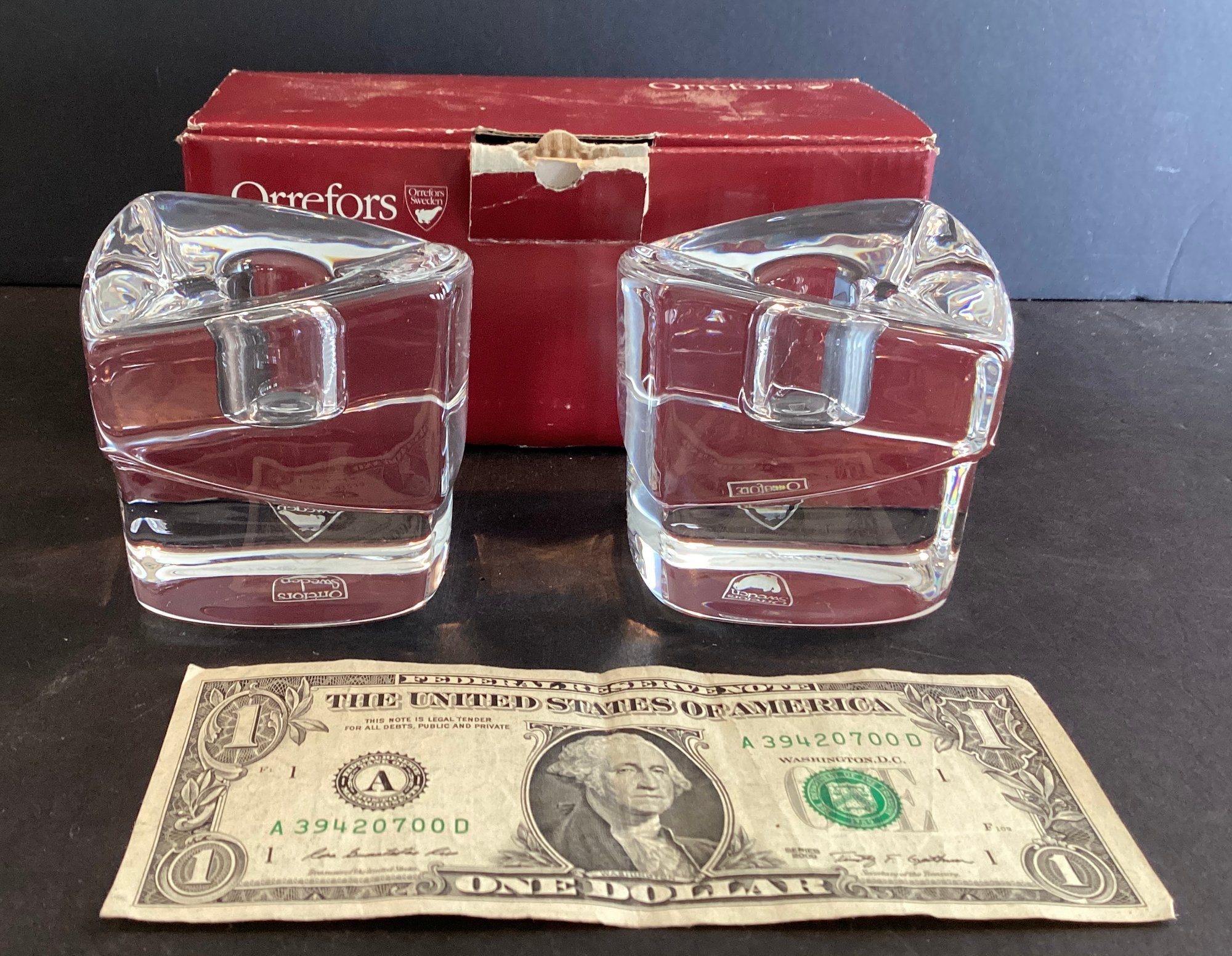 Here we have very beautiful pair of Orrefors crystal candleholders in an abstract design. These candleholders appear to have never been used, and still have the Orrefors/Sweden emblem on the side, as well as the engraved Orrefors name at the base of each candleholder.