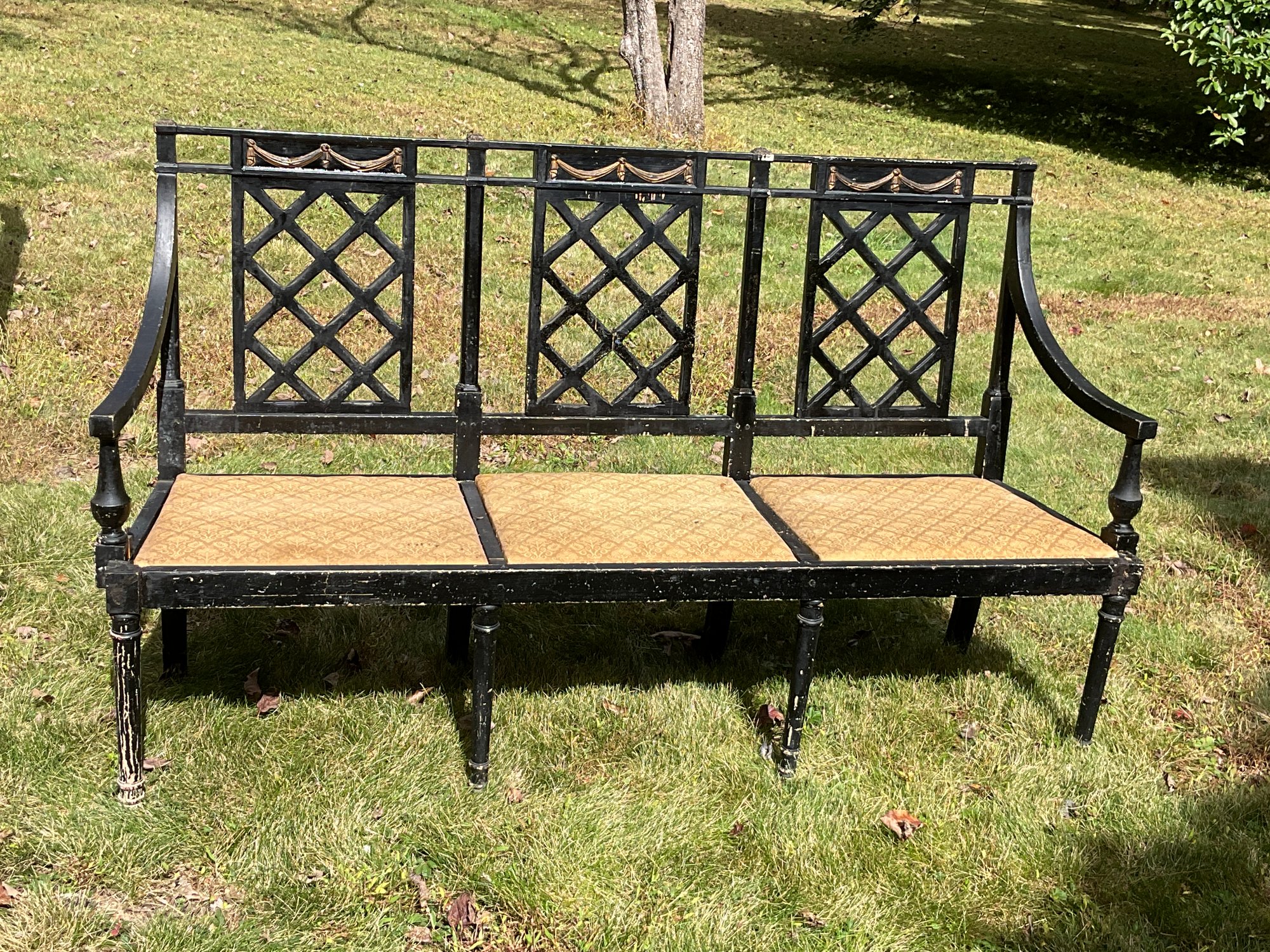 Very nicely made triple settee in original black paint. Very good quality. Needs attention and upholstery at some point. Rare form worth the effort appears to be hand made with pegged construction.