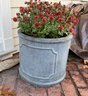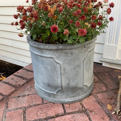 This is a pair of older composition, Georgian style planters. They’ll have a touch of formality to your entrance or patio. Lead grey finish.