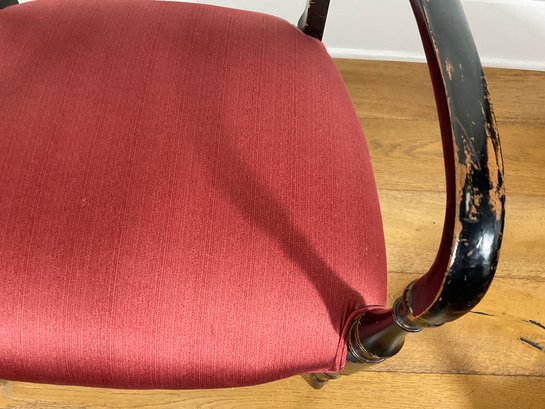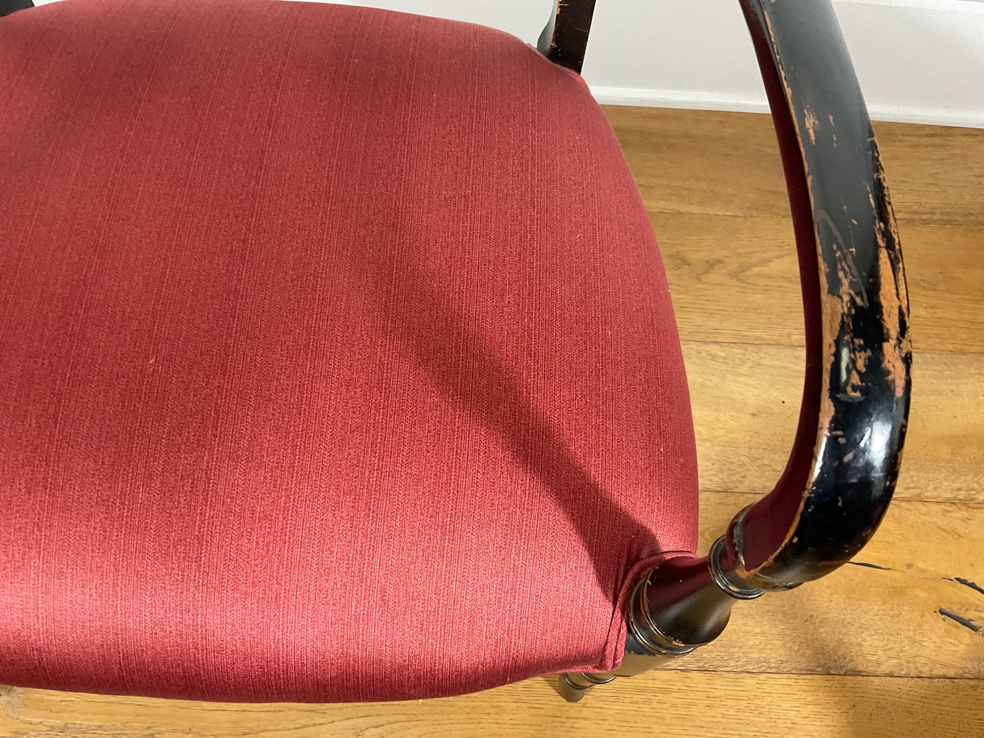 Here is a very nice quality pair of Sheridan style armchairs and black paint with lattice, work back and small elliptical inlay. The chairs have a nice firm, upholstered seat and bamboo turned legs. These chairs are not antique however they are quality older versions. Very comfortable and can be used in most any room in the house.