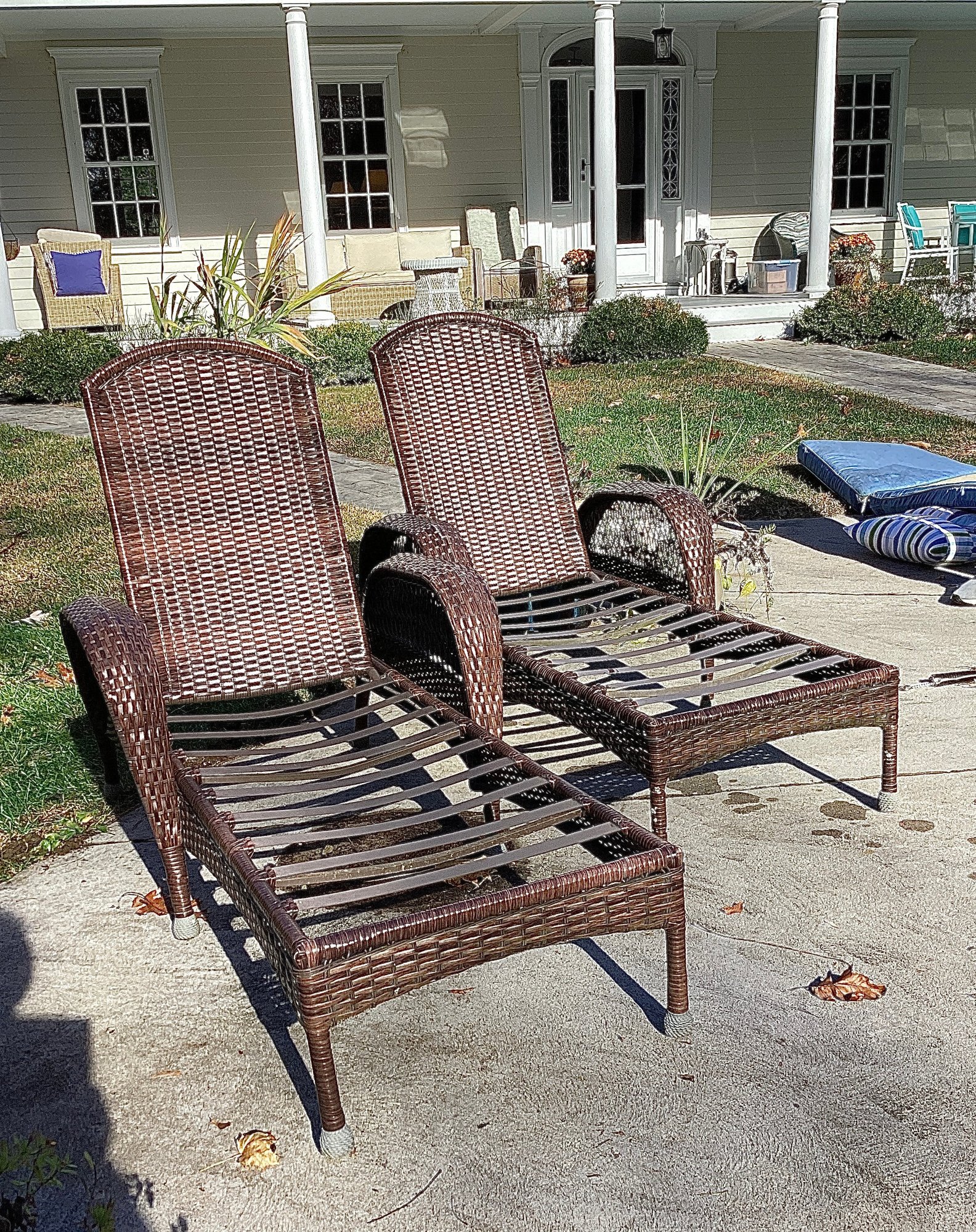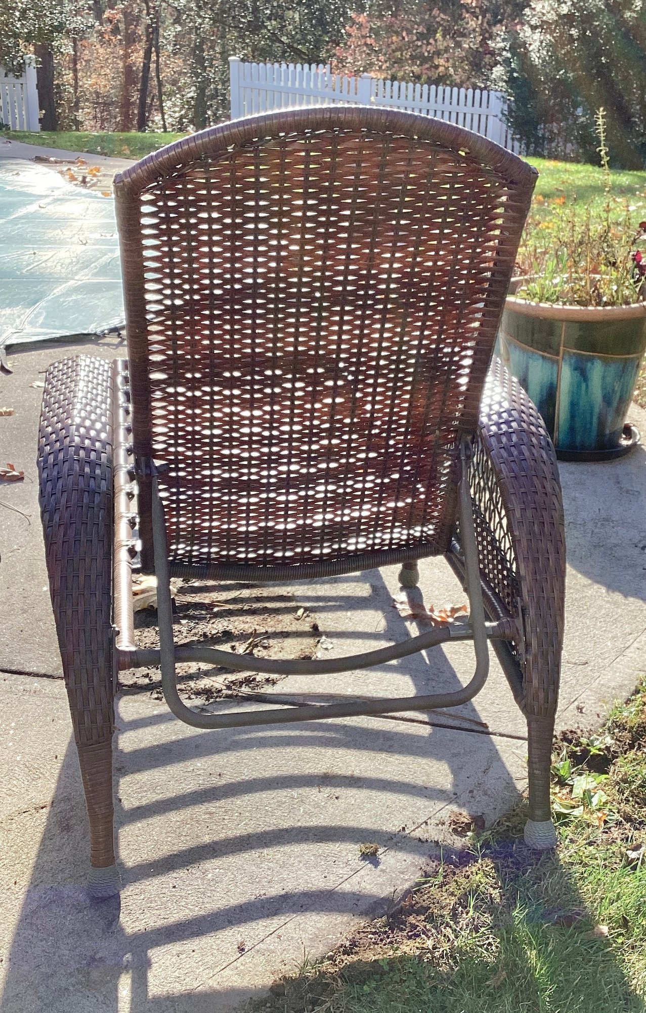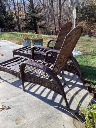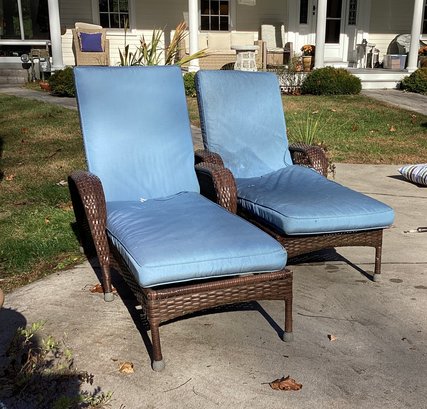 Here’s a pair of outdoor chaise lounges with the original cushions. Very sturdy very usable no damage visible ready to use. Outdoor vinyl wicker.
