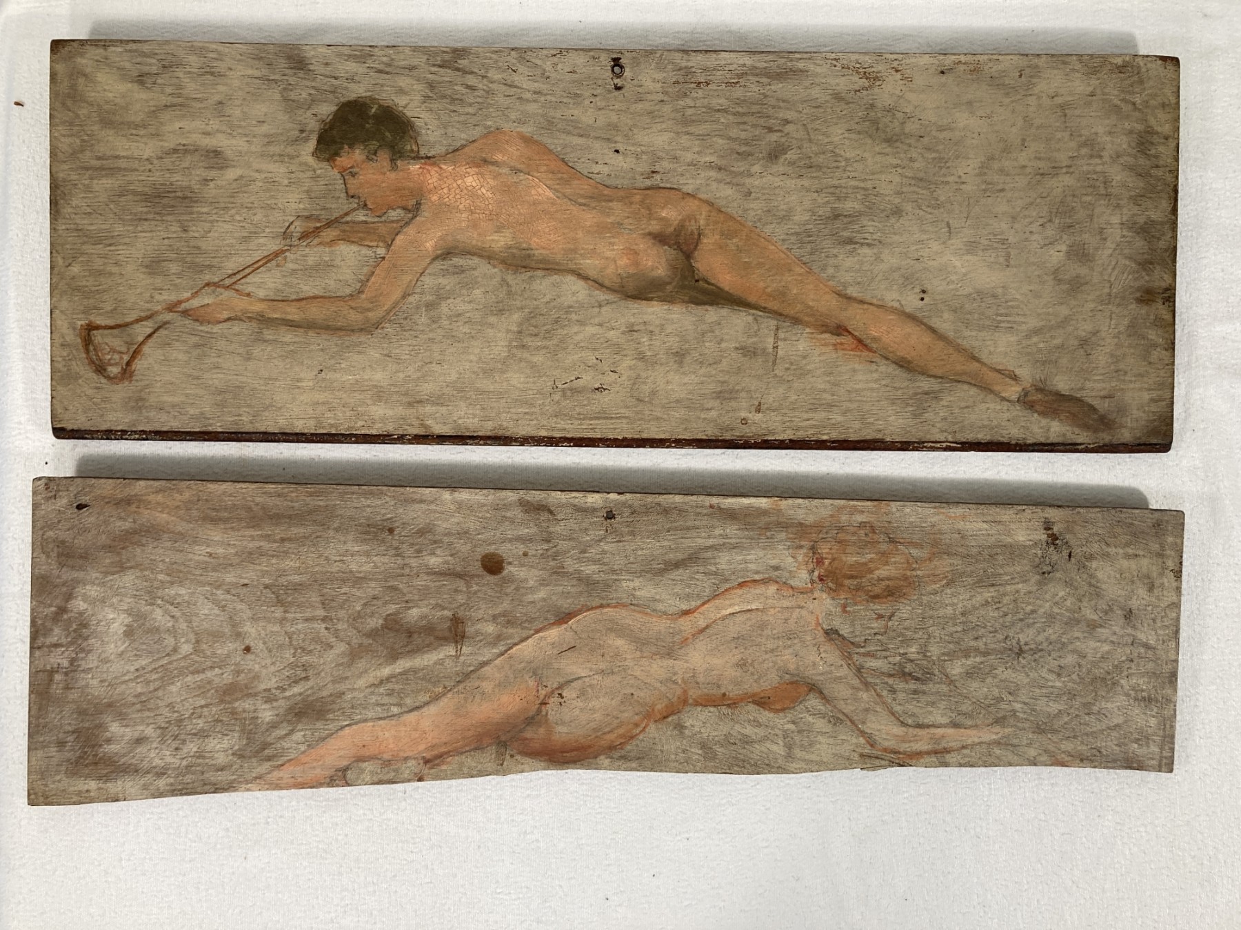 Selling a pair of vintage painted nude figures on oak wood panels. Nice looking, c 1960s-1970s.