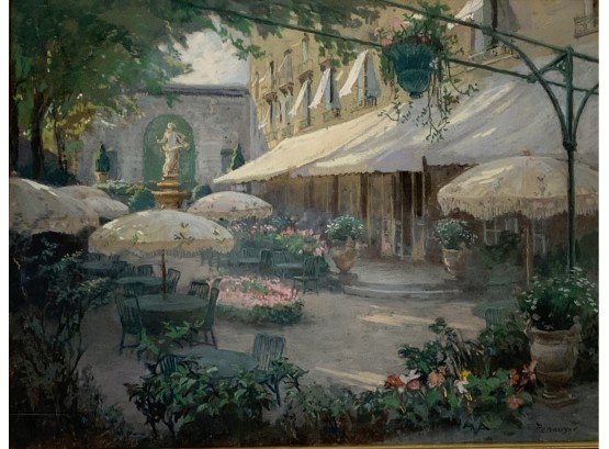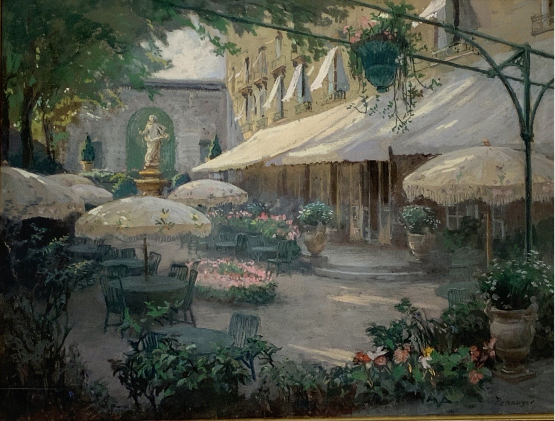 Selling an original Albert Pennoyer (1888-1957, CT) crayon and pastel painting on paper depicting a Spanish courtyard scene with. Very intimate colorful scene. Framed and matted under glass. Original frame cost $400.00.