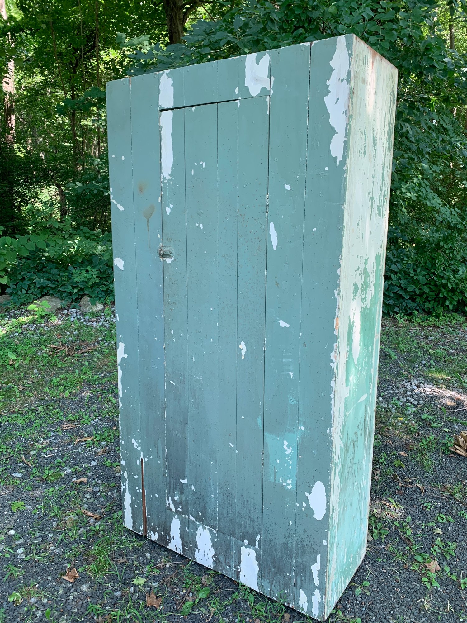 This jelly cupboard has never been stripped and refinished. It was found in the seller as it was left there probably 100 years ago. It’s all square nail construction, and the wood is pine. I don’t believe it was cut or bottom. Just a nice primitive jelly cupboard Measurements 73” tall, 38” wide, 16” deep