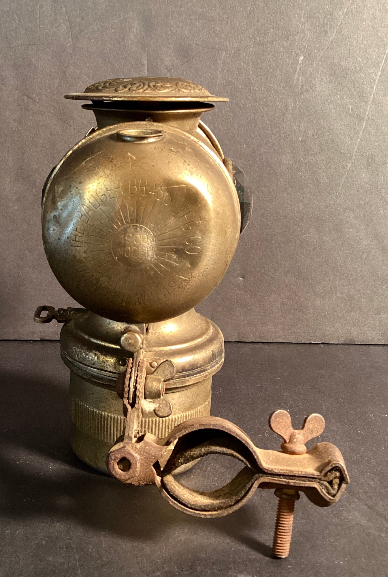 This is an antique artifact, from the Badger Brass Mfg. company from Kenosha, Wisconsin.
