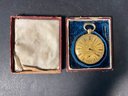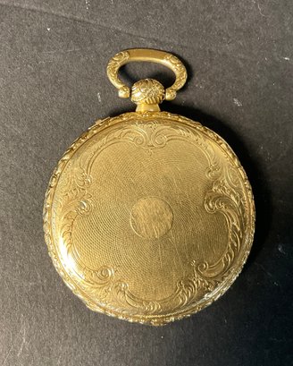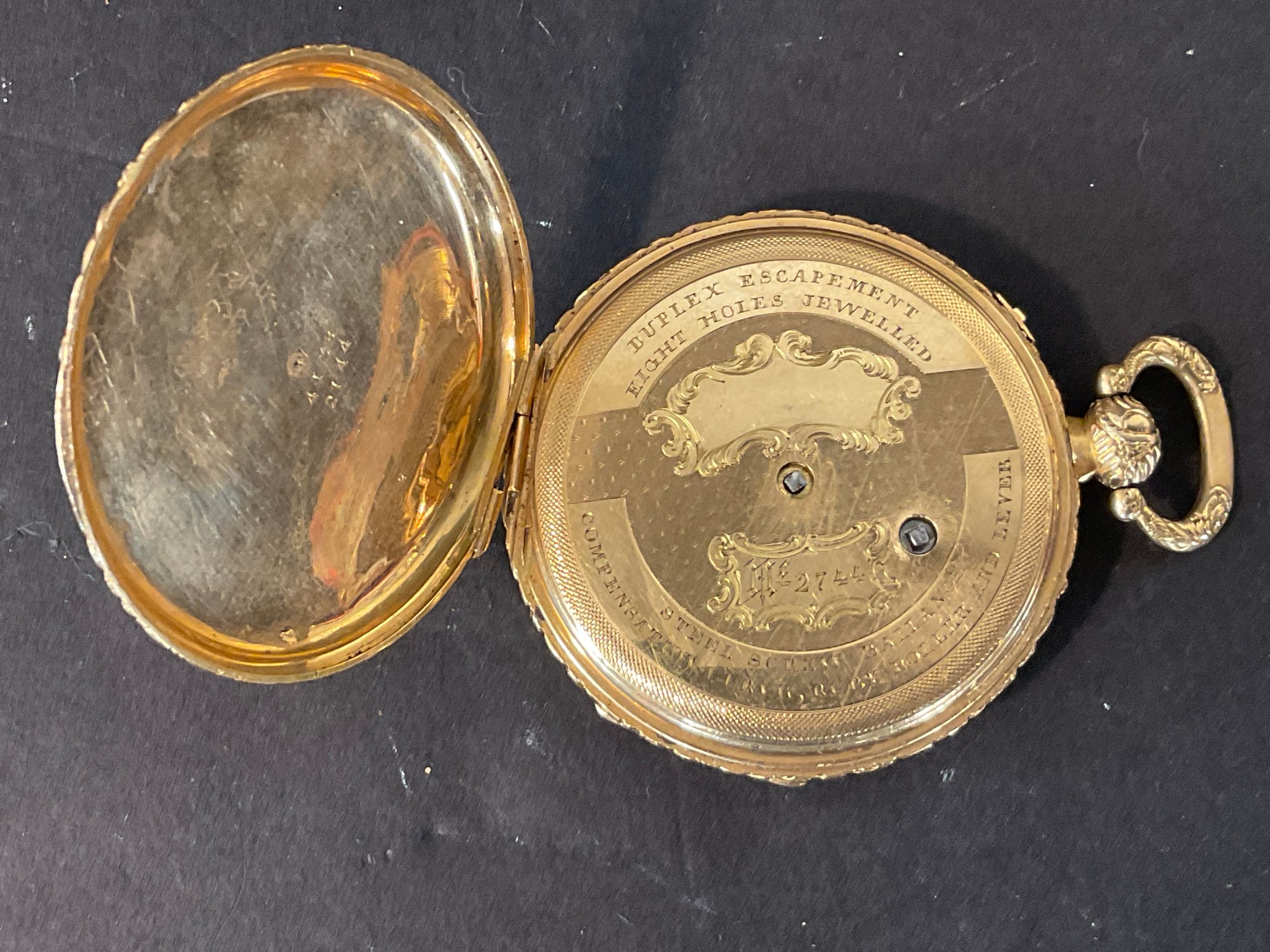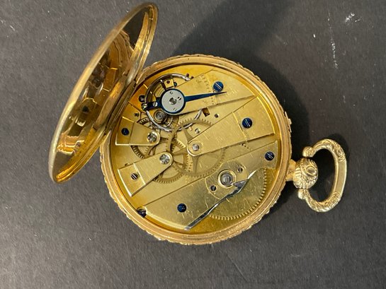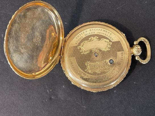 This has been tested it is solid 18 karat gold. Extremely fancy face with a crystal. Back opens to reveal the following “duplex escapement eight whole jeweled number 2744 steel screw balance, compensation curve, ruby, roller, and lever.