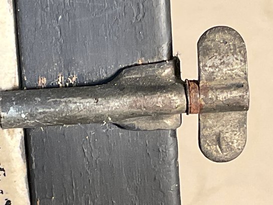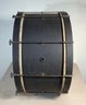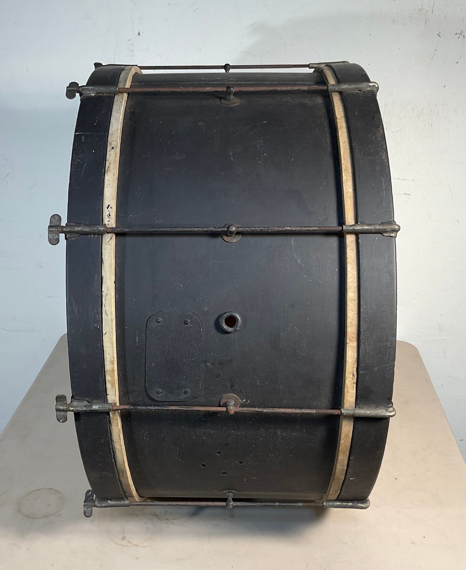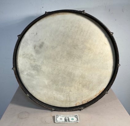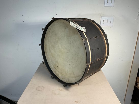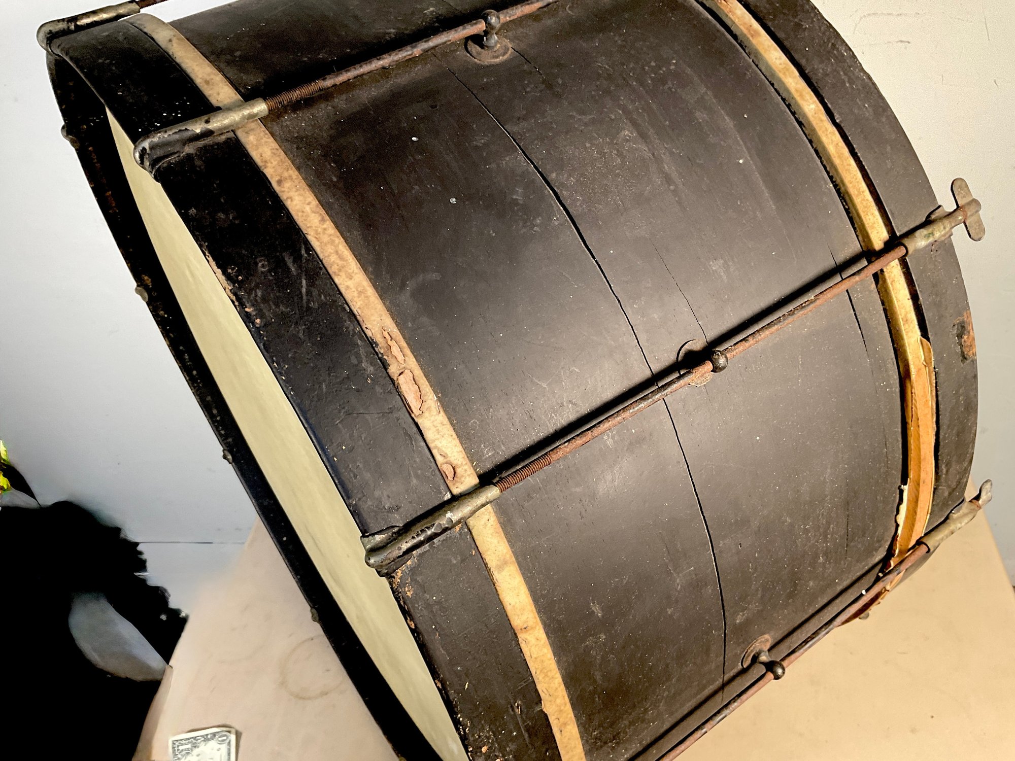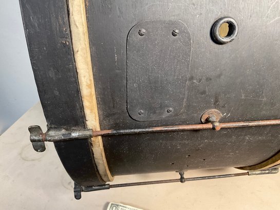 This is a very large drum 26 inch diameter and 14 1/2 inches deep. It looks to be all original. It’s a wooden frame someone has painted black. It has a split, which doesn’t affect the sound for some reason and it’s not the tracking to the drum itself