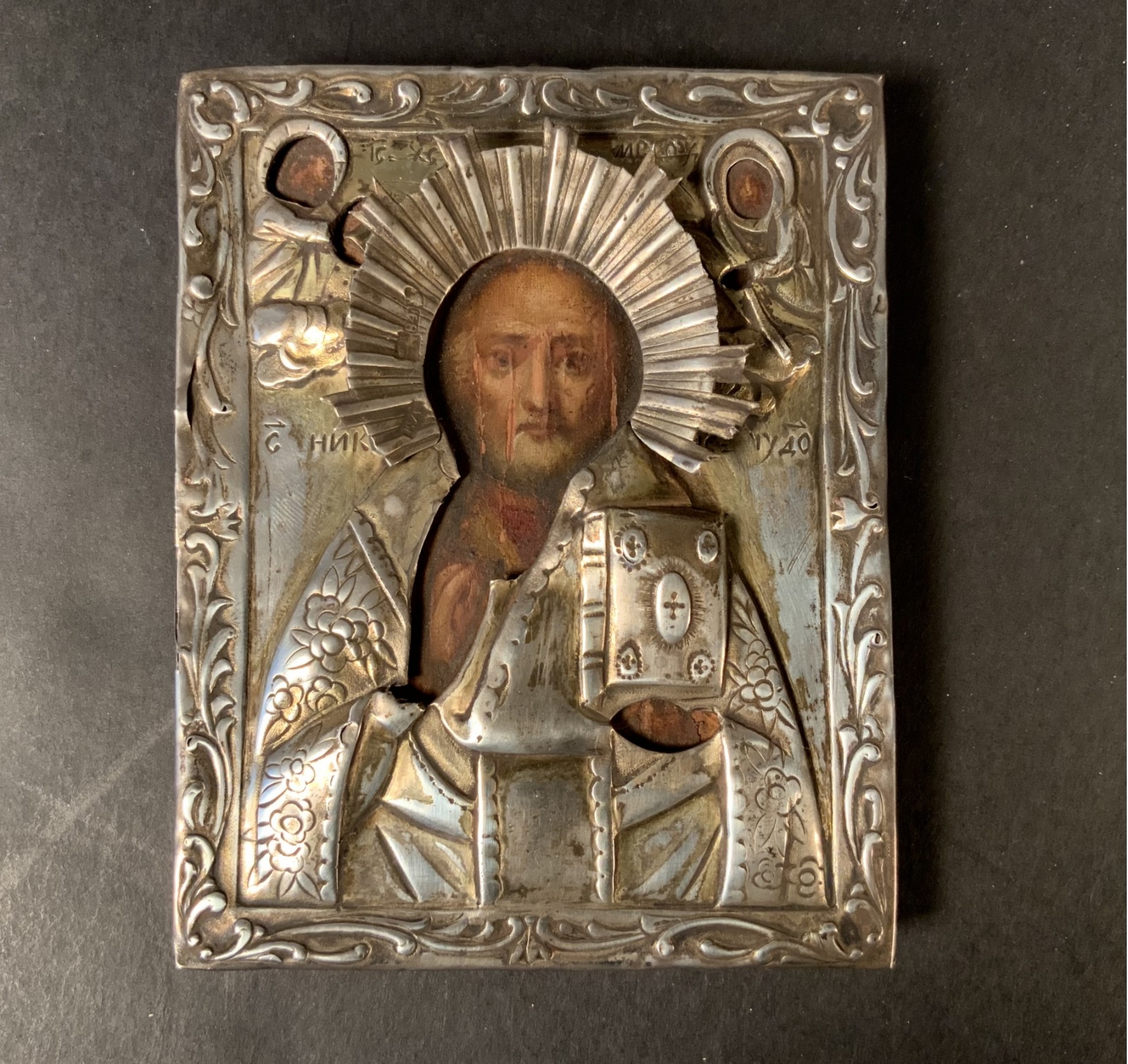 A very nice original hand painted Russian Icon. I have not taken the front off but I sure it is all original. There are 4 painted parts in all. Hallmarks on the beams emanating from the larger painting and also hallmarked on the side ( both are pictured)