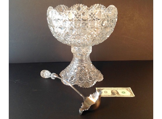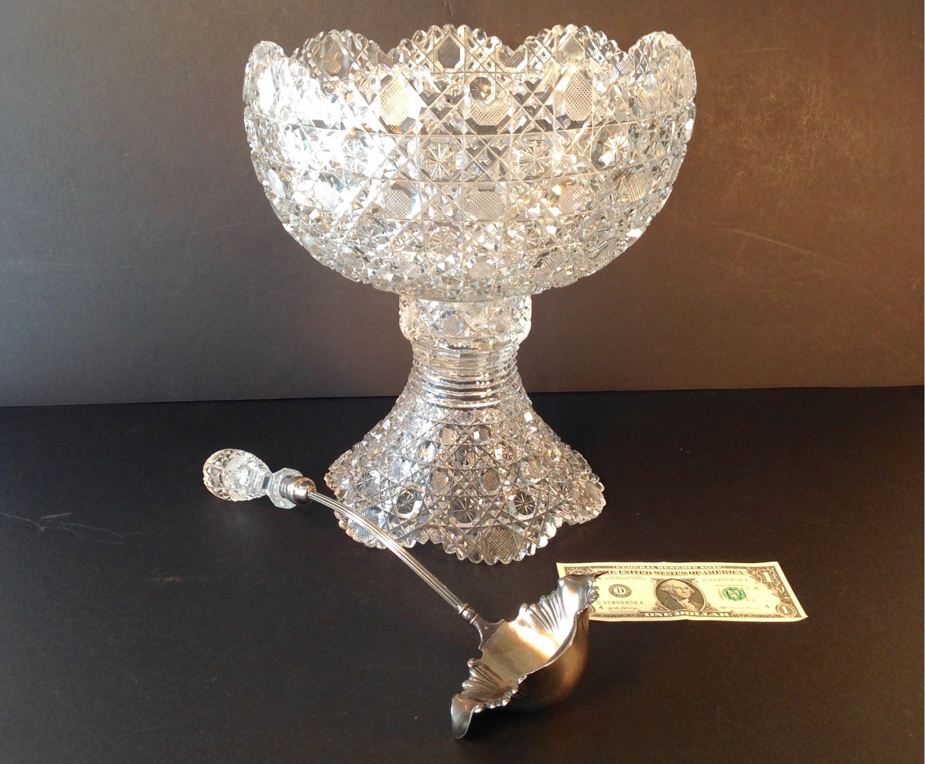 All original, A heavy cut glass punch bowl in th Daisy& Button Pattern with the original ladle. A couple of very small chips easy fix if you really wanted to. No Teeth Missing. No Heavy Scratches.