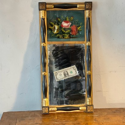 The reverse painting on glass in this mirror is original as well as the mirror glass itself. the frame looks untouched with the original gilding and paint.A nice small delicate mirror from the 19 century.