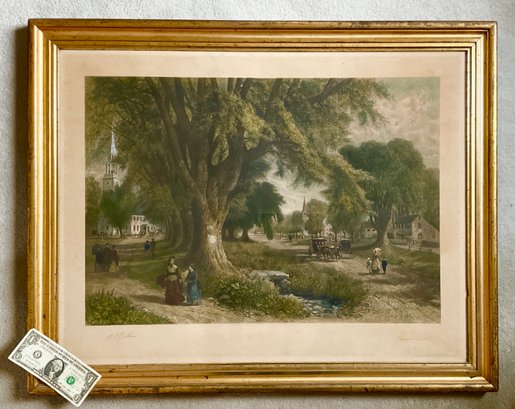 1878 The Village Elms by Albert Fitch Bellows Tinted Engraving by J Duthie .THE VILLAGE ELMS. SUNDAY - SUNDAY MORNING IN NEW ENGLAND. Albert Fitch Bellows (November 20, 1829 – November 24, 1883), American landscape painter of the Hudson River School. The original painting this etching is based upon a painting done by Albert Fitch Bellows. The engraving was done by James Duthie. About 1878. and signed by the artist and the etcher. the frame is an original 19 century, lemon, gold leaf frame, this etching has not been altered in size. American circa 160-1870