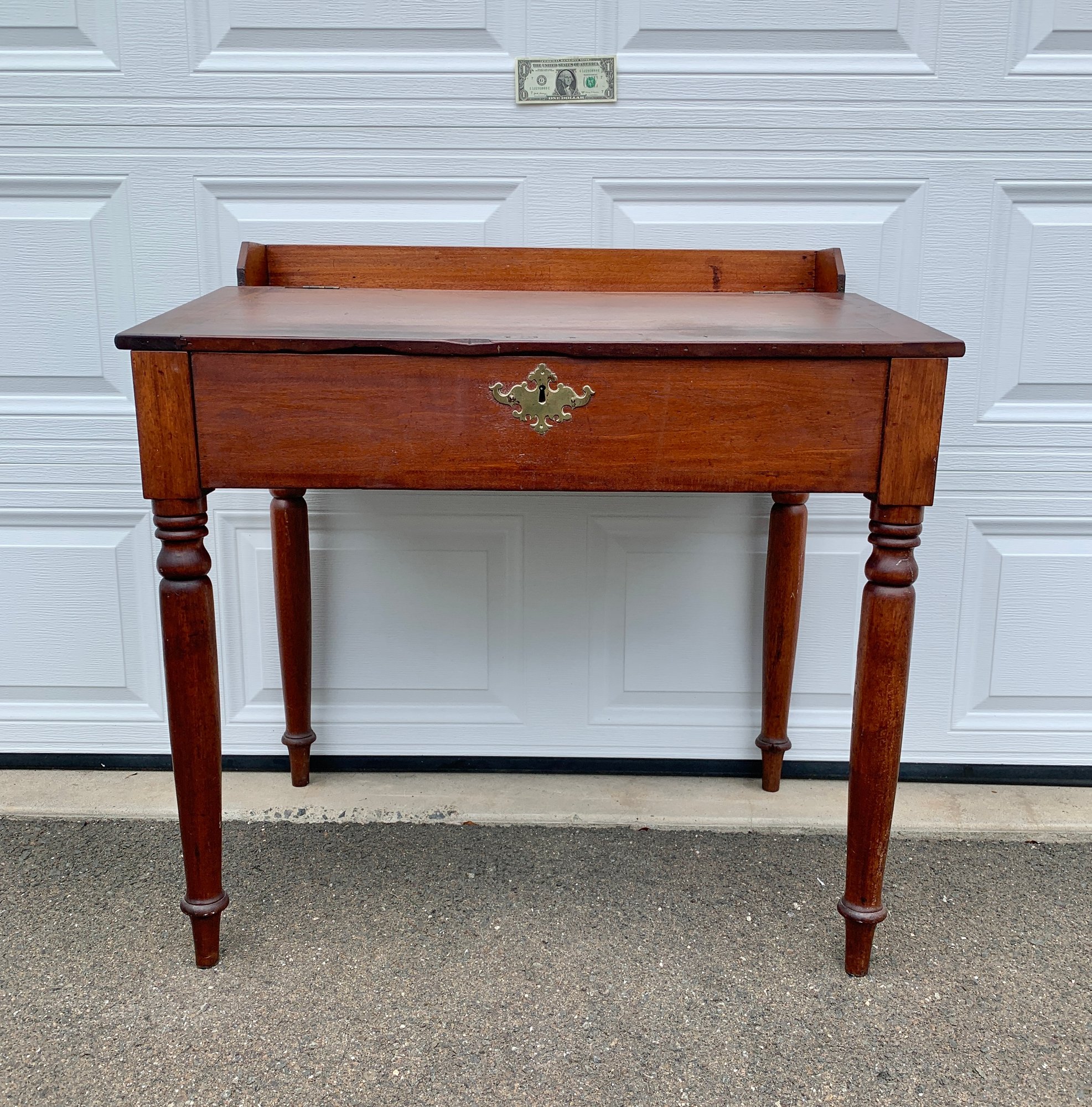 Circa 1840-1850 this solid walnut slant lid schoolmasters desk is a great size sturdy and in good condition. It has a very nice small gallery in the back .The hinges have been replaced. A very nice mellow finish. The interior has several small cubby holes. All solid walnut and very sturdy. New England. Very good condition.