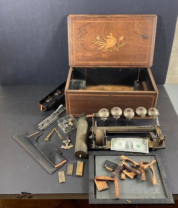 hooked up in the attic way under some eaves. I found this music box. It appears someone is taking it apart and not put it back together. If it’s missing any parts, they’ve got to be very few if any.