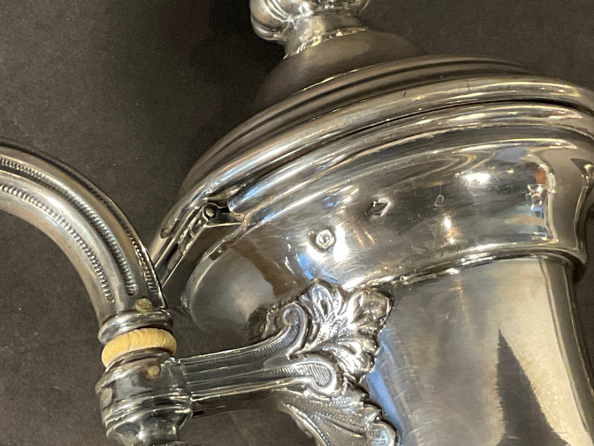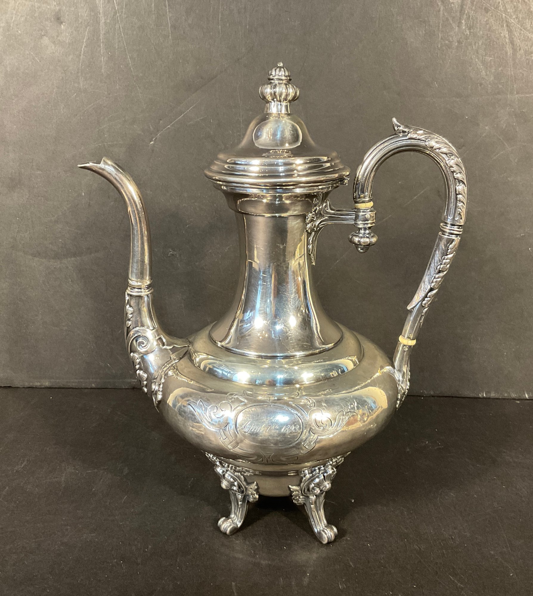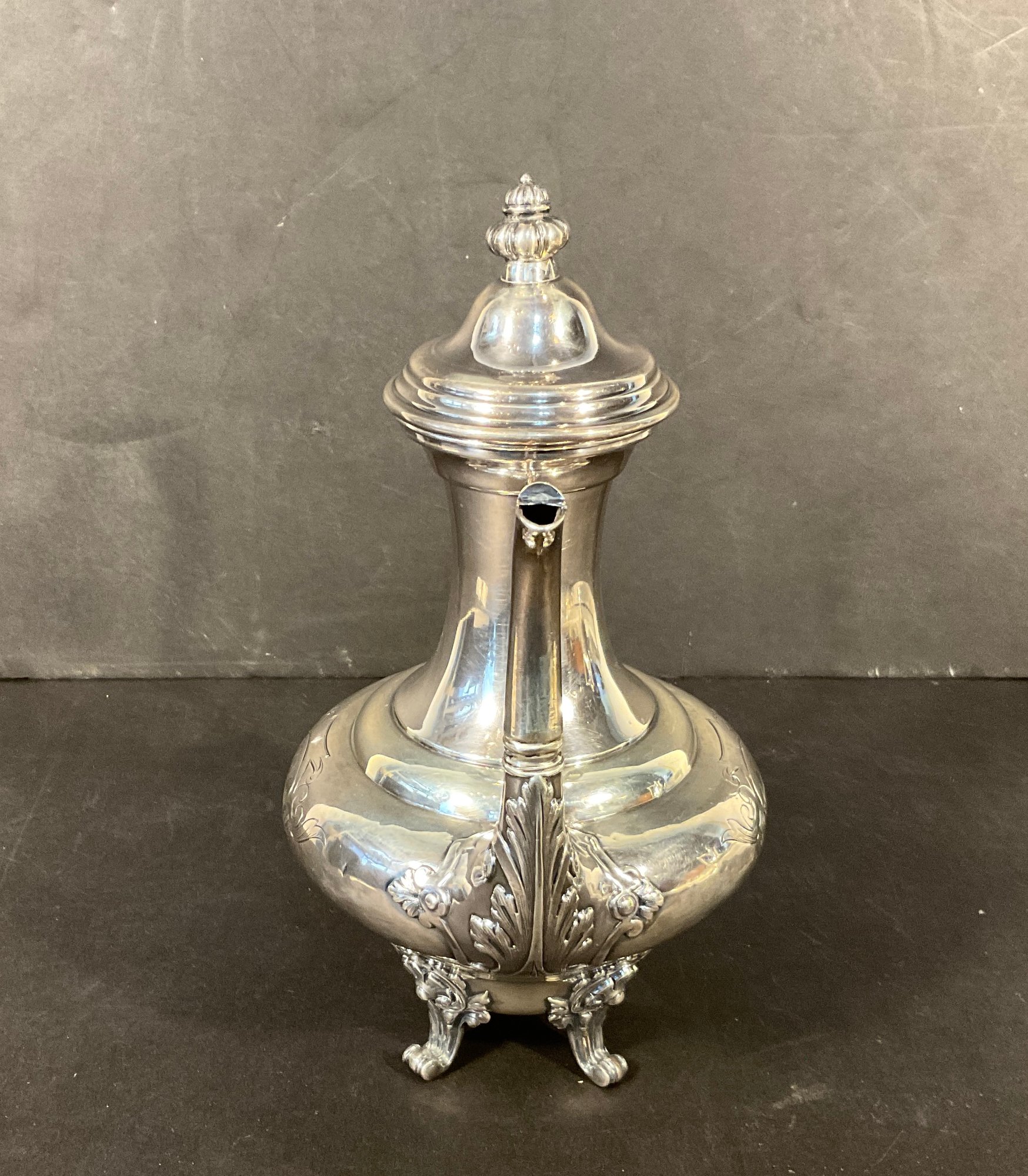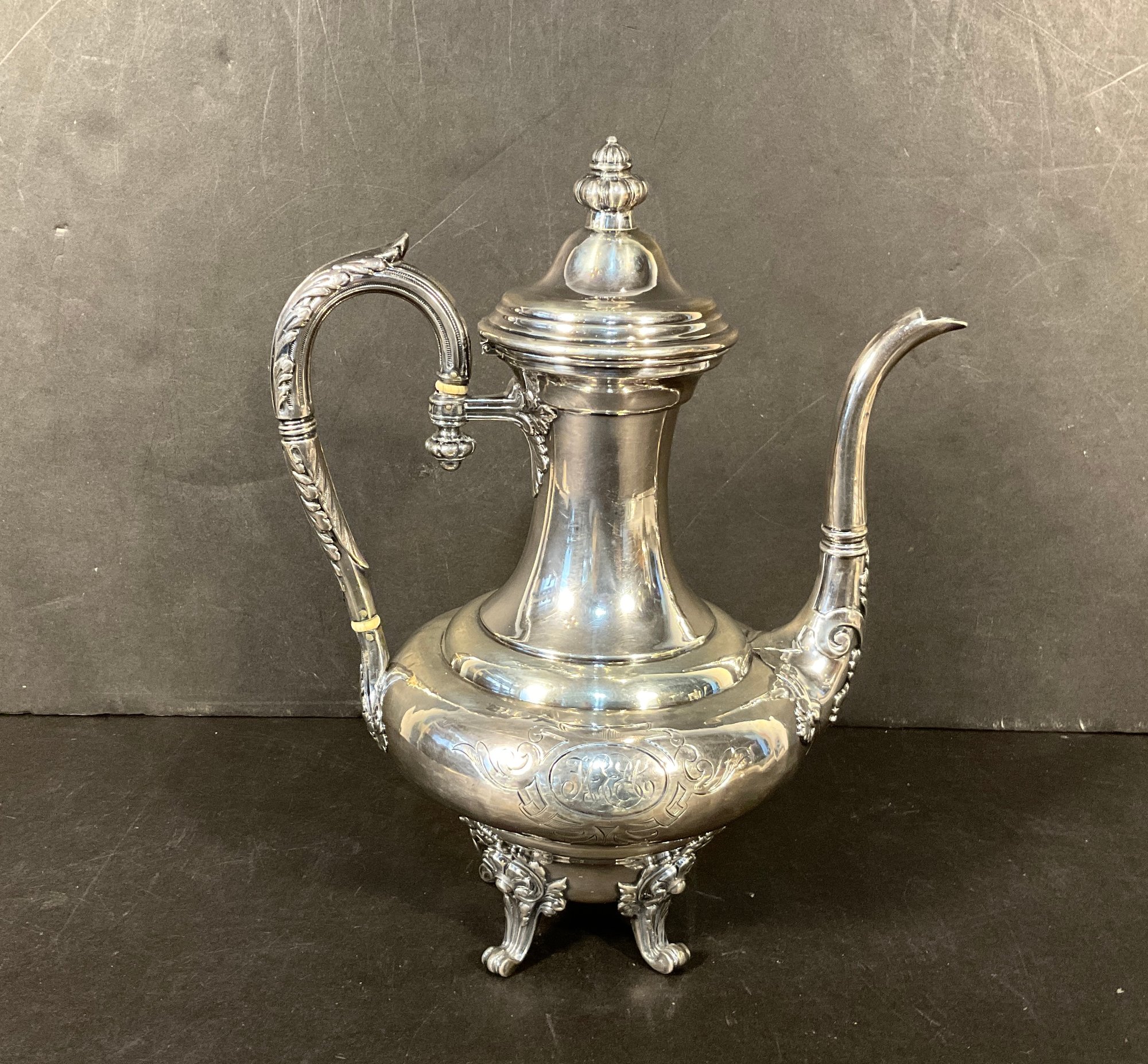 This silver tea pot is a great example of French silversmithing at its finest in the Victorian era. This baroque teapot is a very interesting size and it has hallmarks as you can see in the picture it is monogrammed and is in very nice original condition.