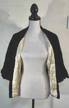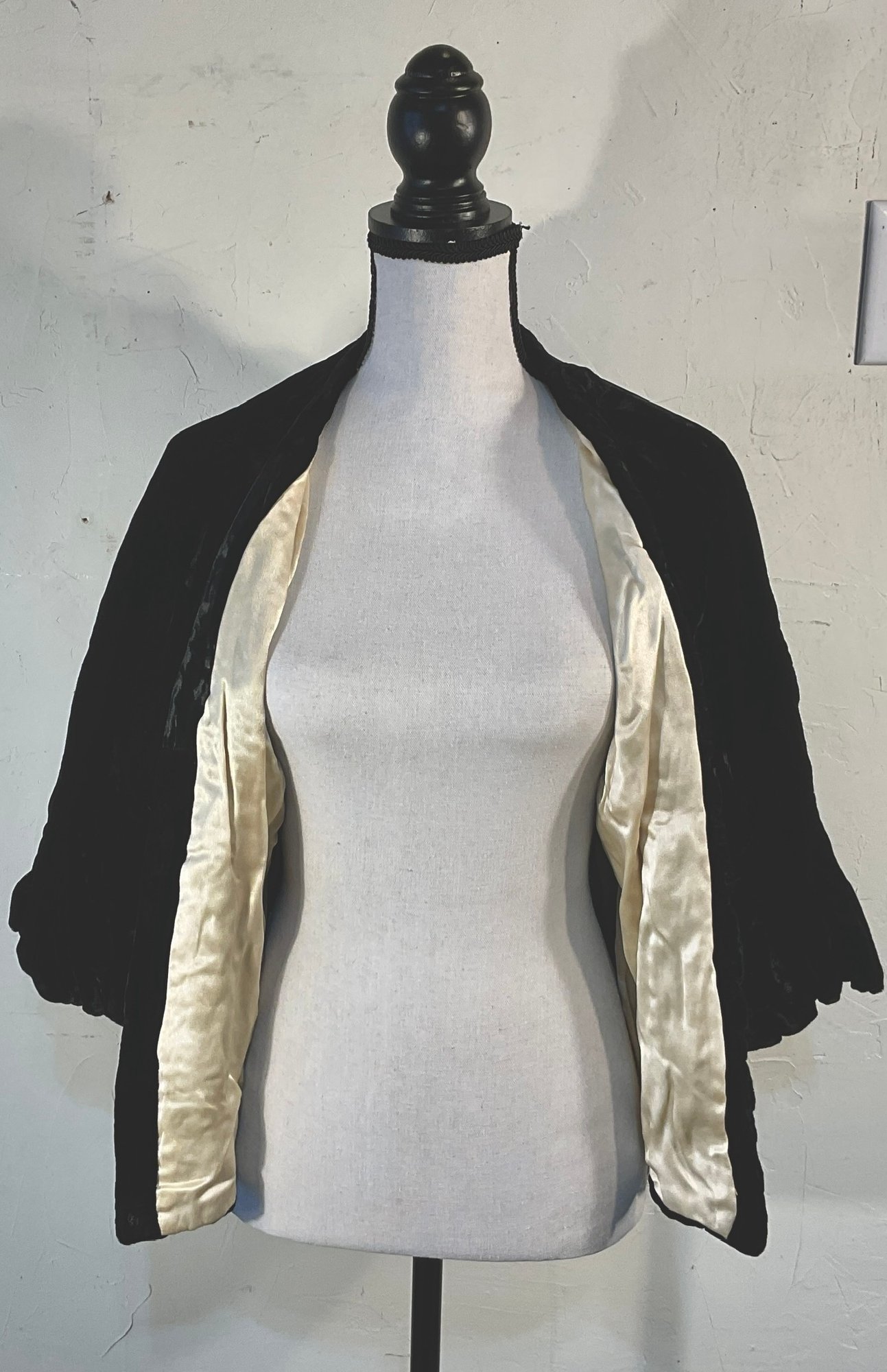 Wow! Here is a great black crushed silk velvet swing jacket. This is an excellent ladies jacket, with ruched lapel don to the base of this swing jacket.