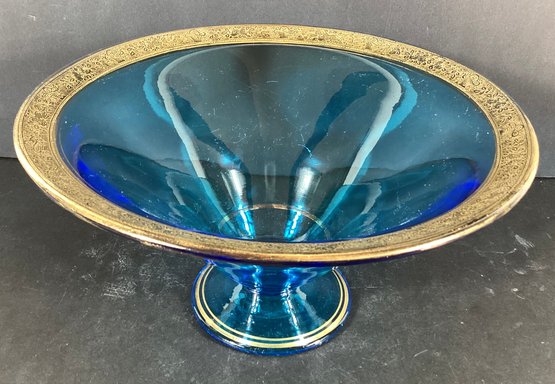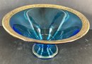 Here we have an exquisite blue glass pedestal bowl. This is an excellent antique condition. The glass is fully intact with no scratches chips or cracks. The guilt metal around the diameter of the bowl has intricate designs and is truly lovely to look at.
