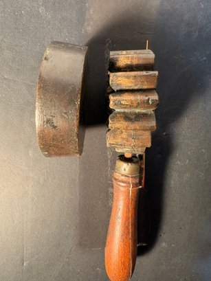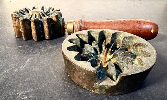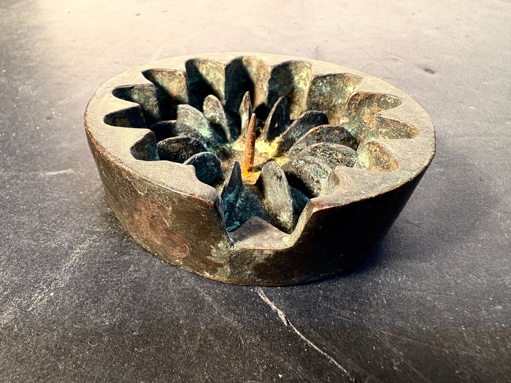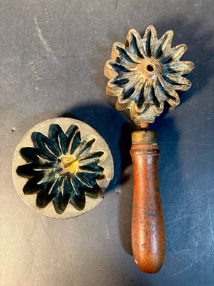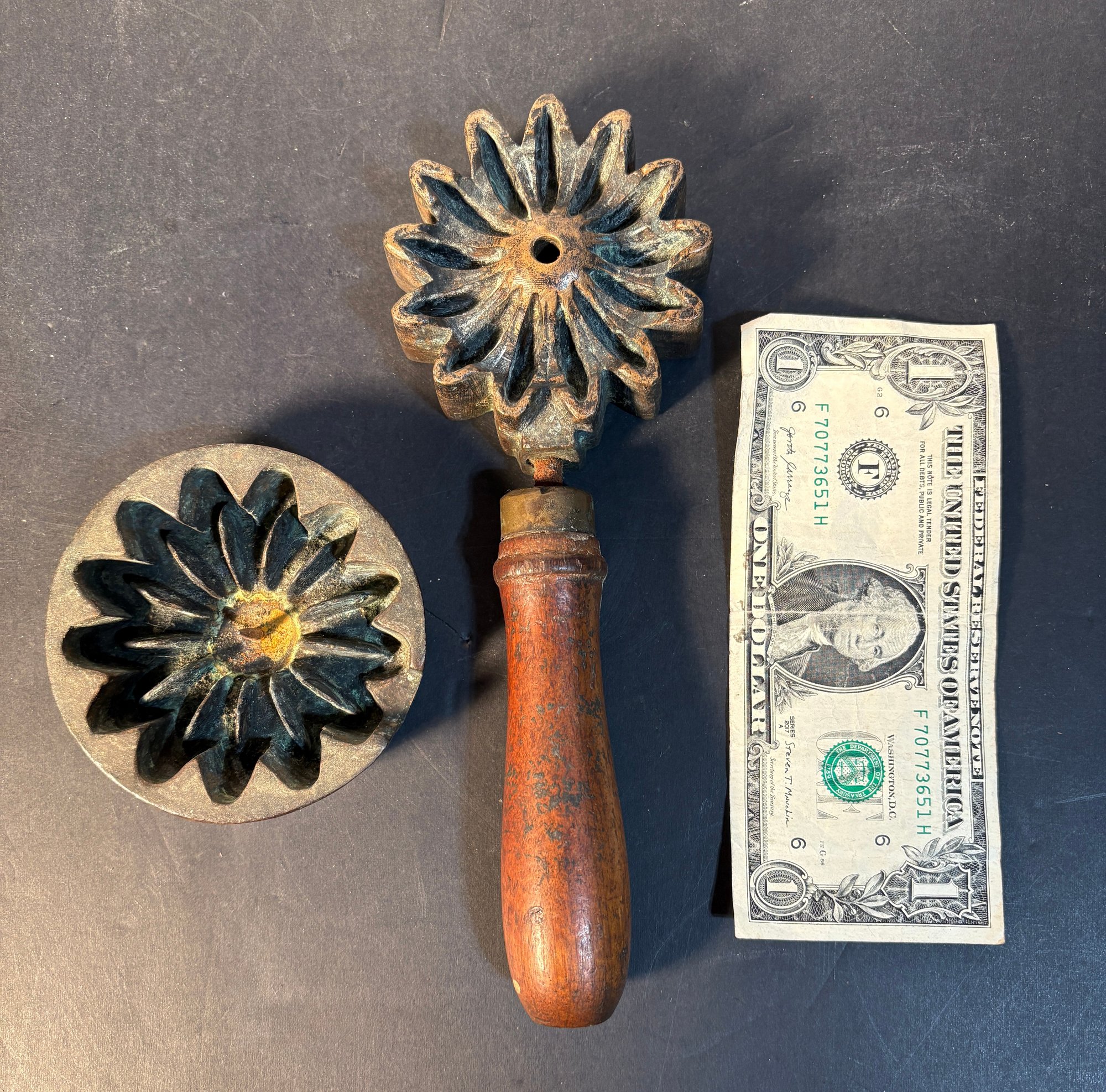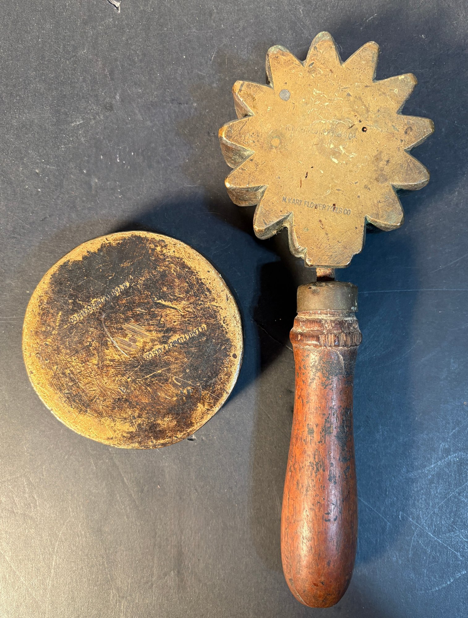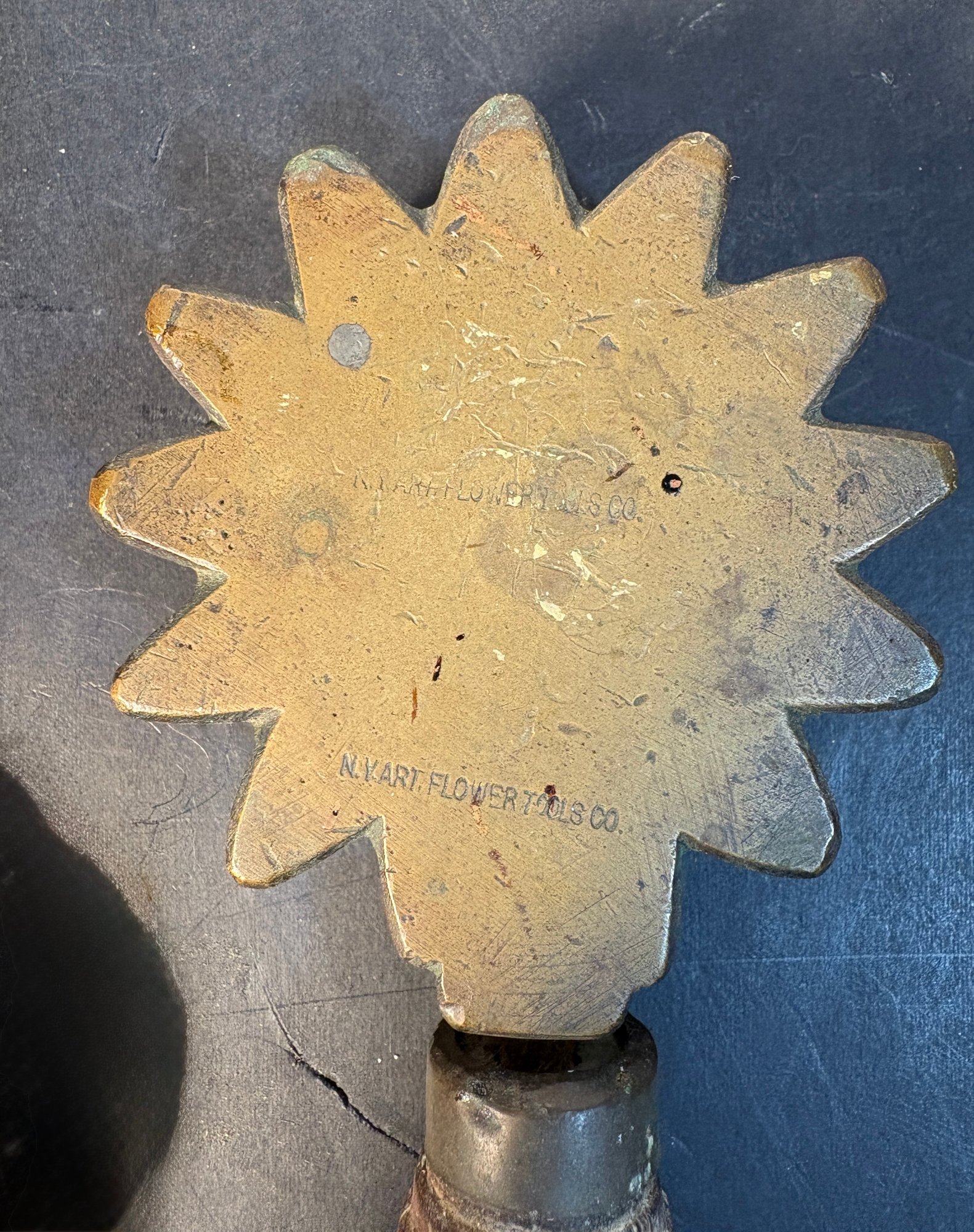 Here we have a very heavy 19 century bronze flower mold used in the production of hat making. It has a substantial walnut handle and is sturdy and I’m sure still working. The presently isn’t very good condition. Ready to be used.