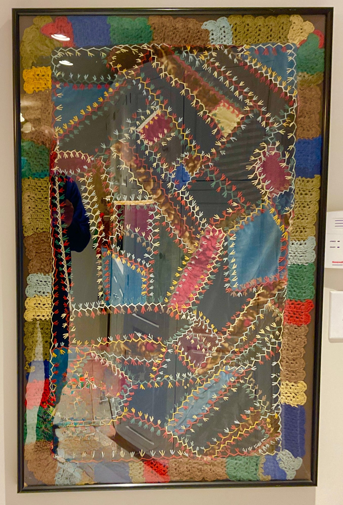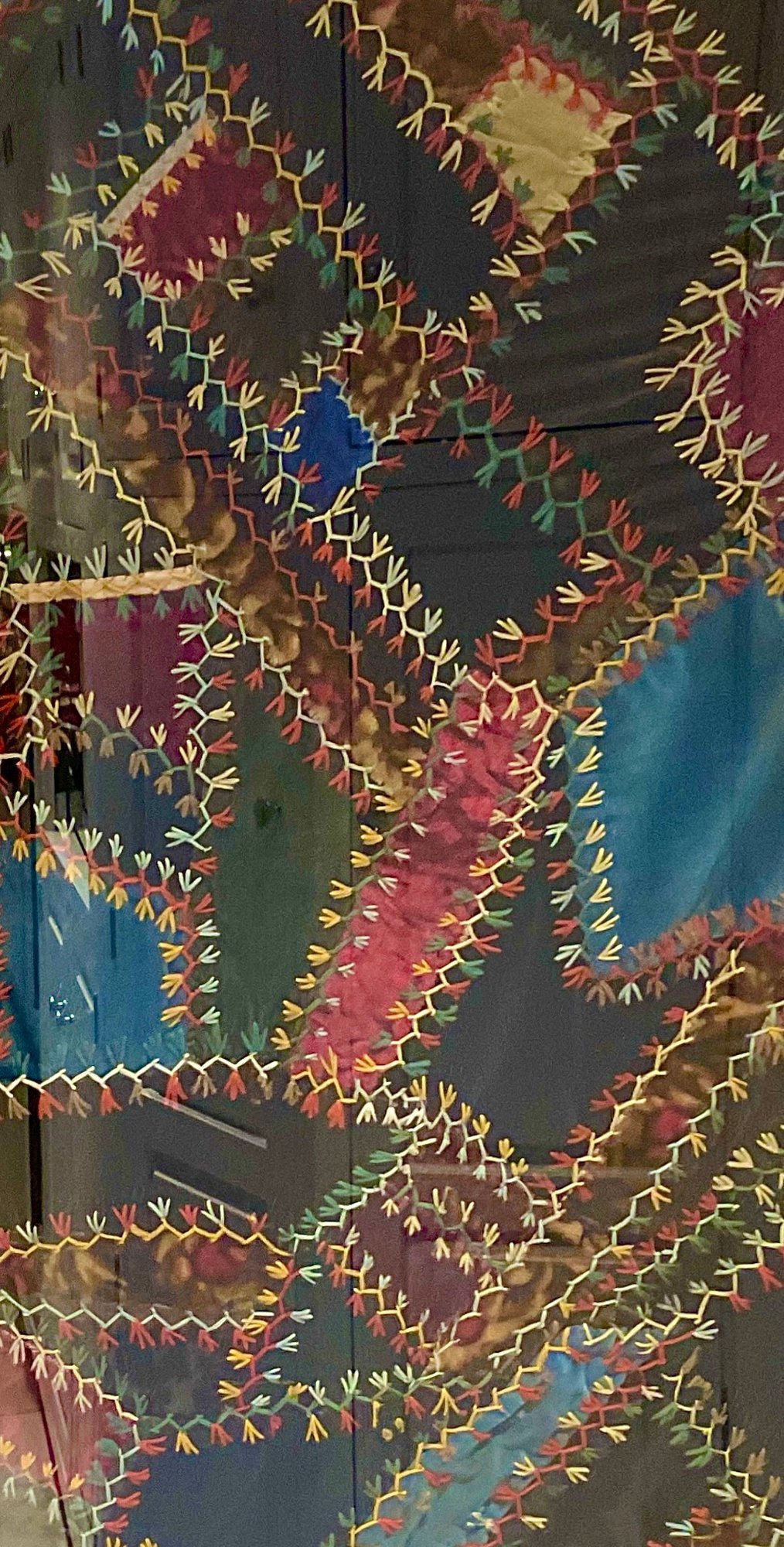 The fabric is in good condition and very artfully done. It has been framed and suitable for hanging on your wall and enjoy enjoying the color and texture.