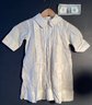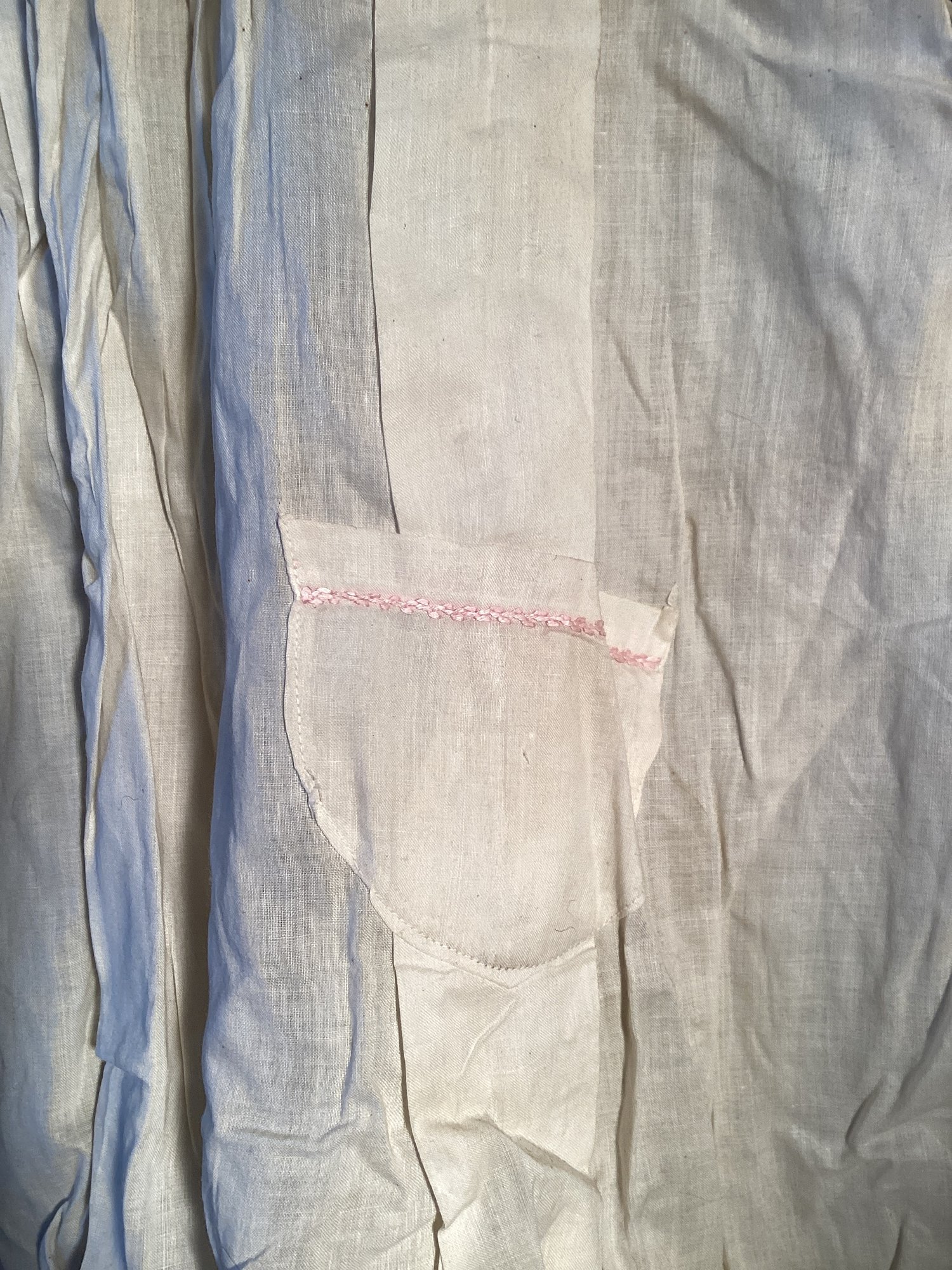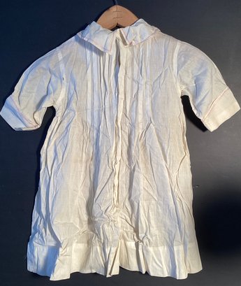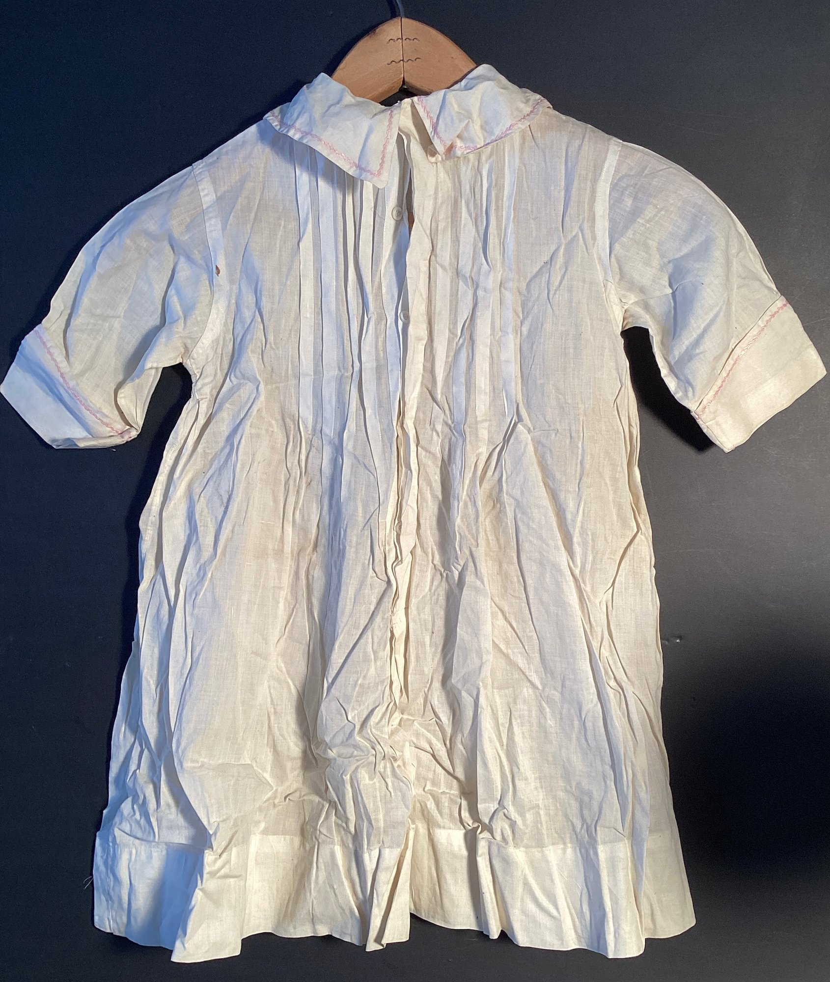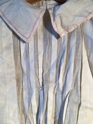 Here is an antique cotton child’s nightgown that was made with fine cotton material and has tiny pink cross stitch embroidery on the collar and pocket.