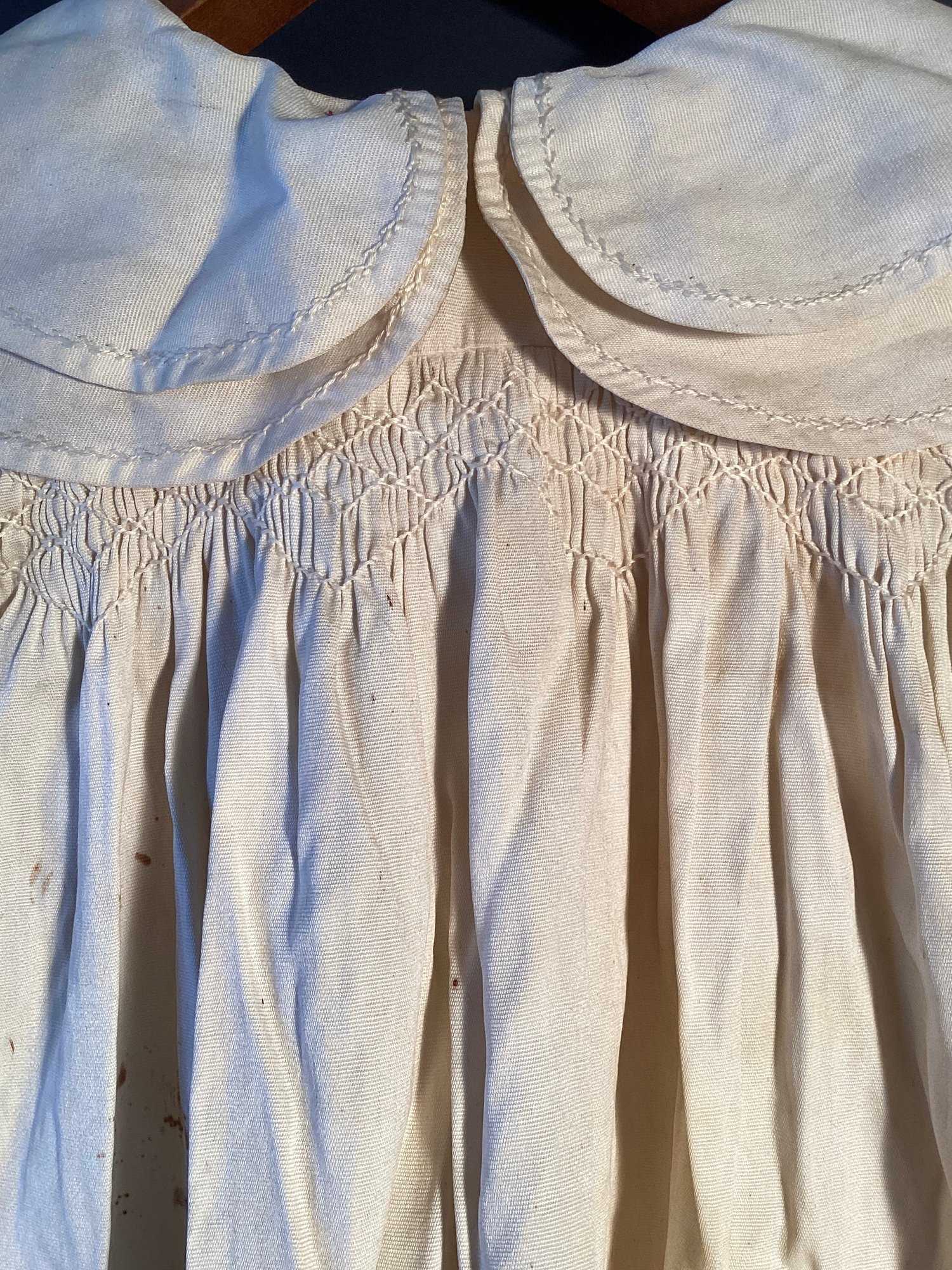 * this dress has a double ‘Peter Pan’ collar, Hans smocking and small buttons to be secured on the back of this dress.