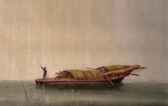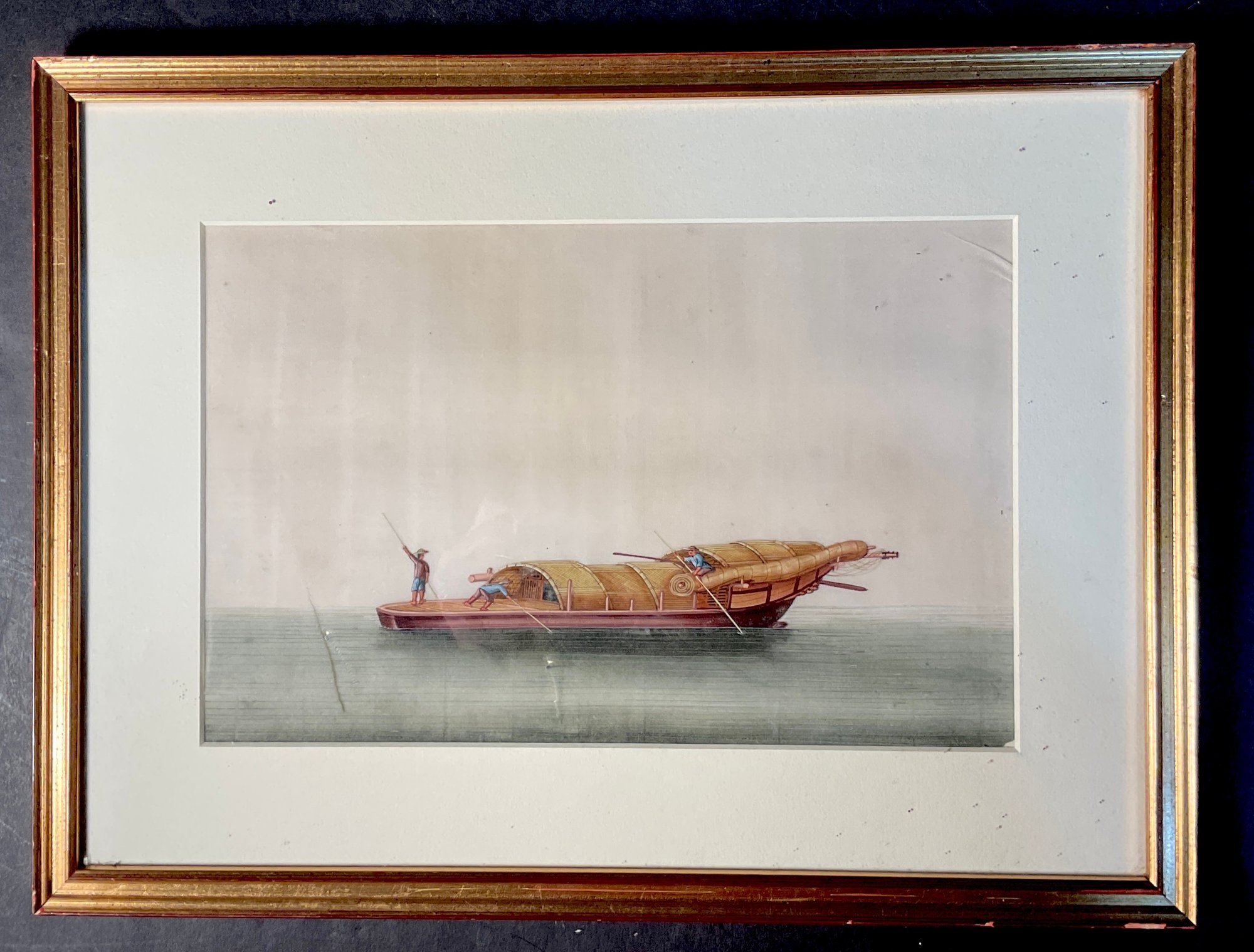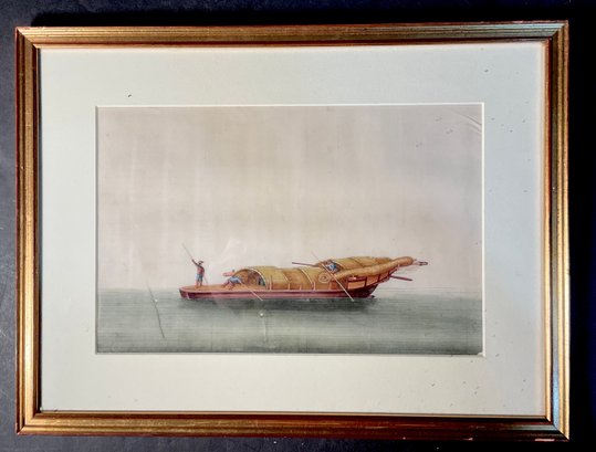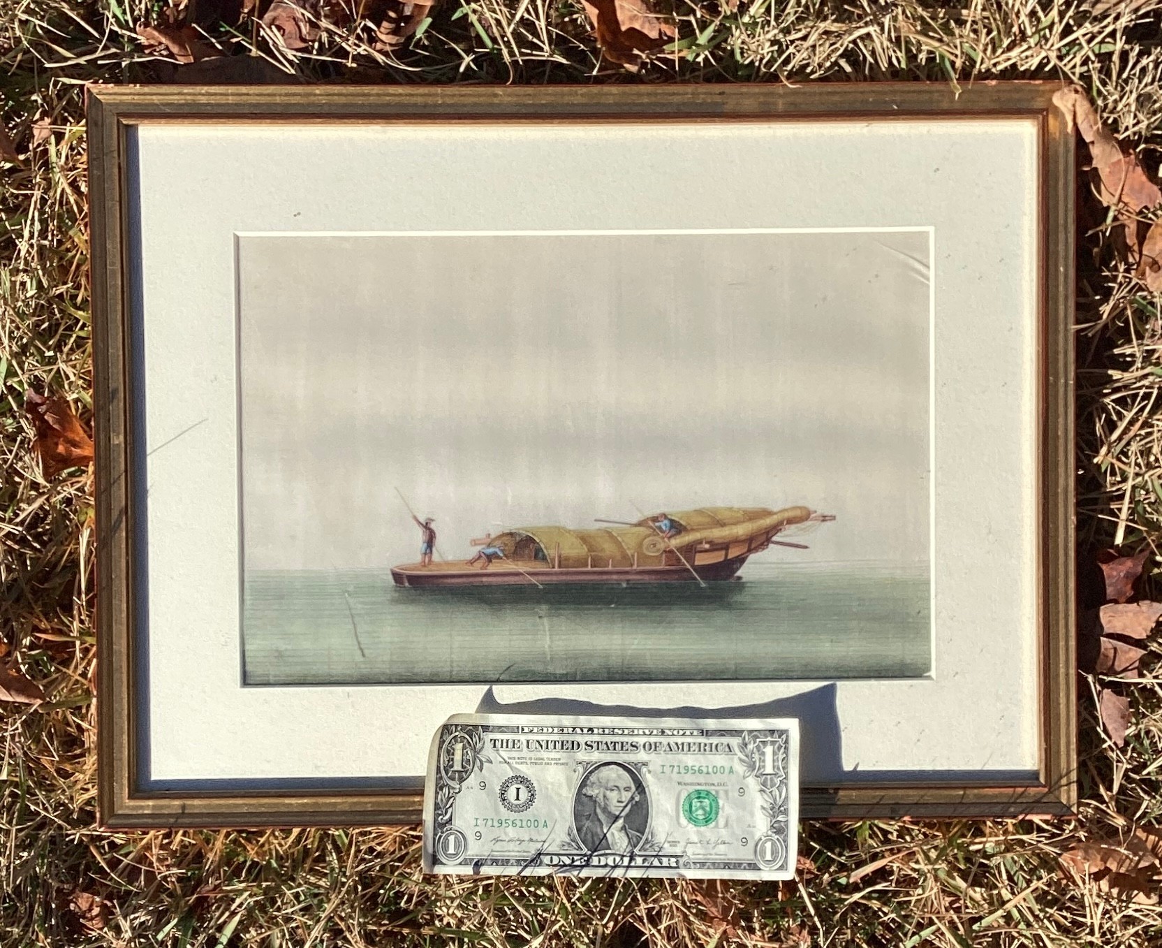 Here is a very nice antique painting. This is a tempora on silk that has three sailors on a wooden transport boat on a calm sea.