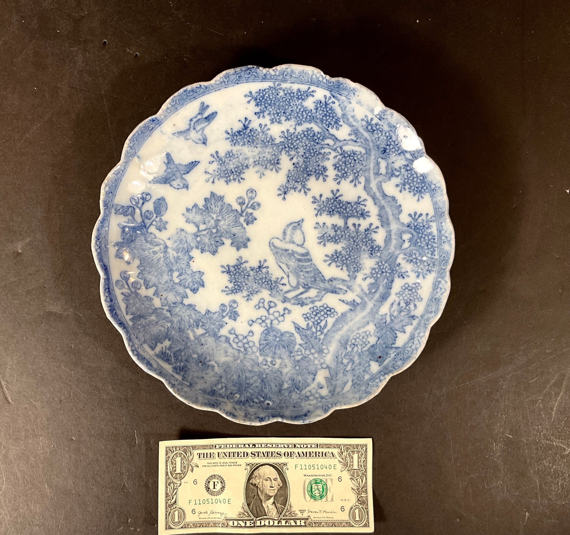 This is a very interesting Asian blue plate, depicting birds in trees. The back is marked. We cannot decipher it. It has the appearances of being very old.