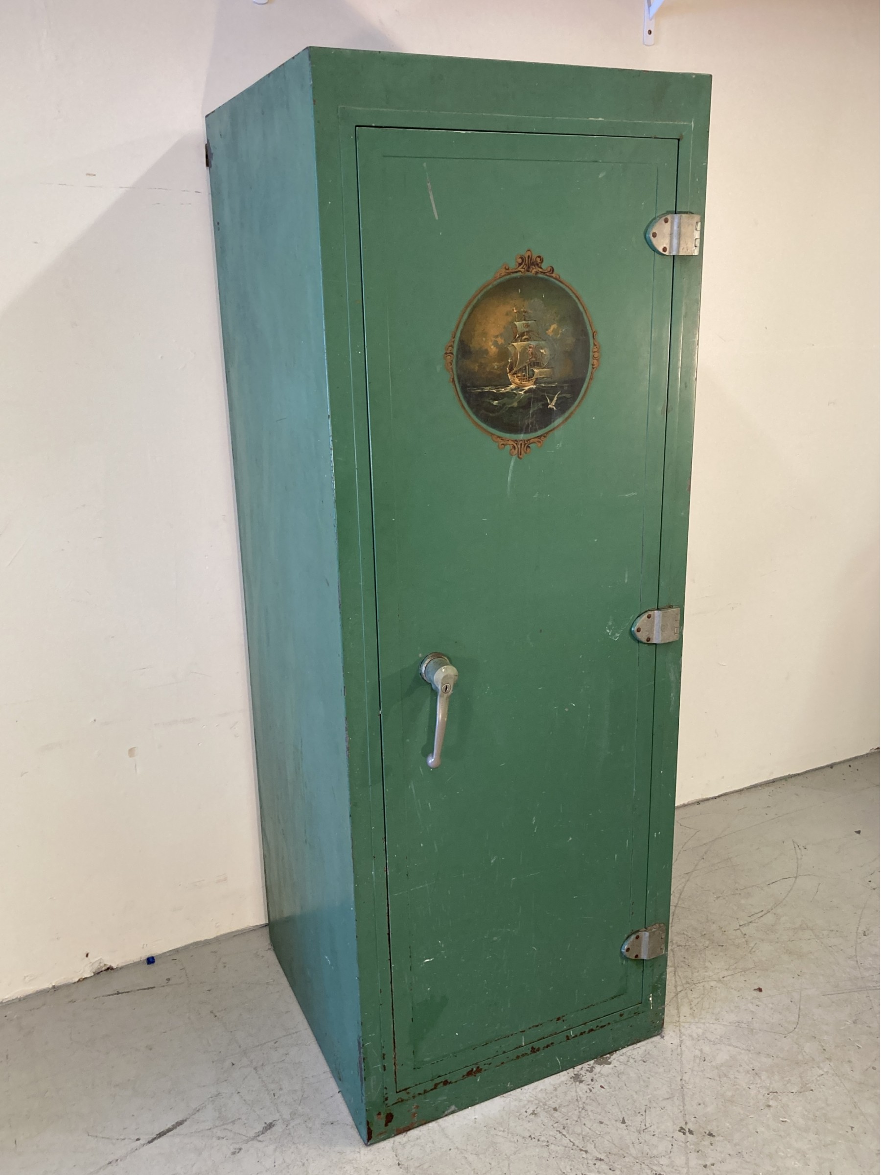 Selling a very cool antique clothes vault by Plymetl, an air tight safe style clothing chest. Great for furs and wool. In original green paint with a lithograph of a ship on the front. Inside has a sliding rack and storage below for boots and shoes.