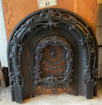 In the mid 1800’s D.S. Quimby manufactured ornate cast iron fireplace surrounds in New York for the Carriage Trade , wealthy people with substantial homes . This antique ( circa 1850’s fireplace surround is one of the finest. Two pieces and complete