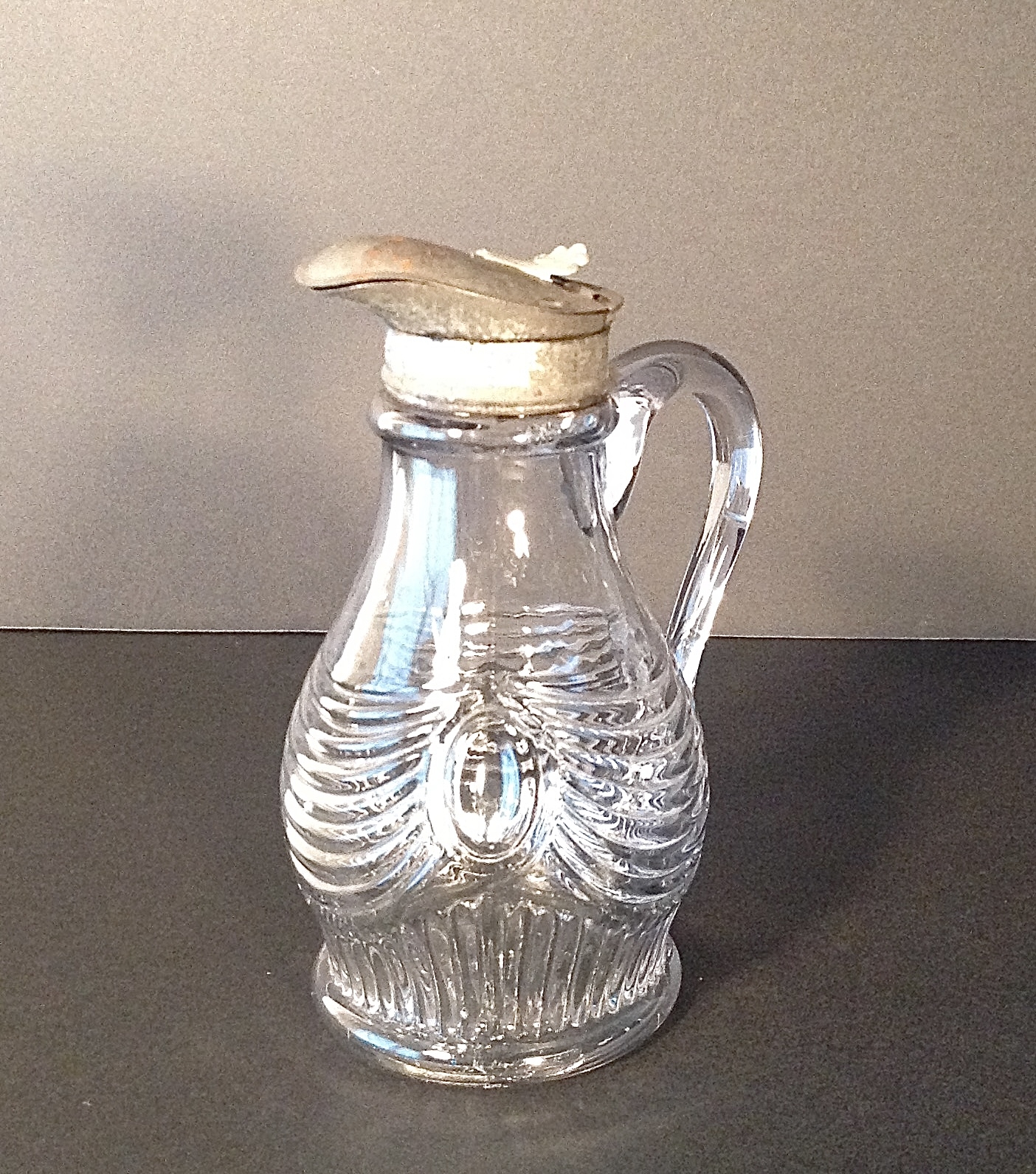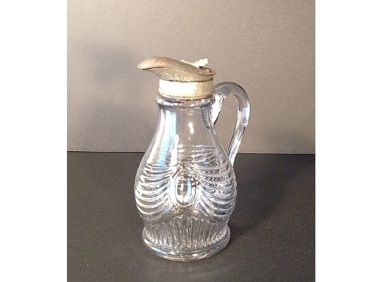 Nifty antique press pattern glass syrup pitcher with a metal lid. The pressed glass has a vintage drape design. Great holding your favorite syrup... bring on the pancakes!