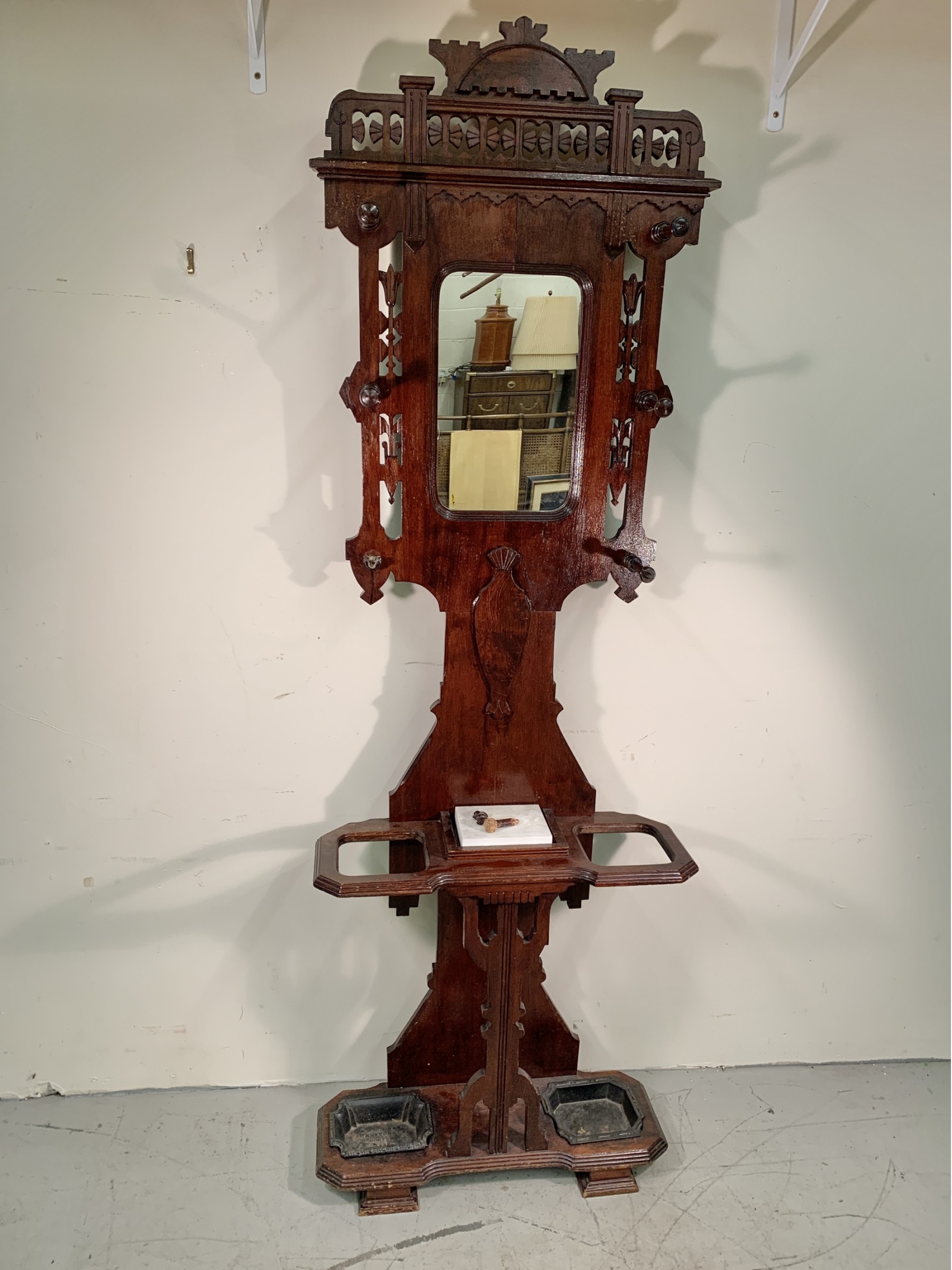 Carved solid walnut, circa 1880s. American hall tree. Coat and hat rack with umbrella racks.