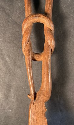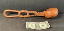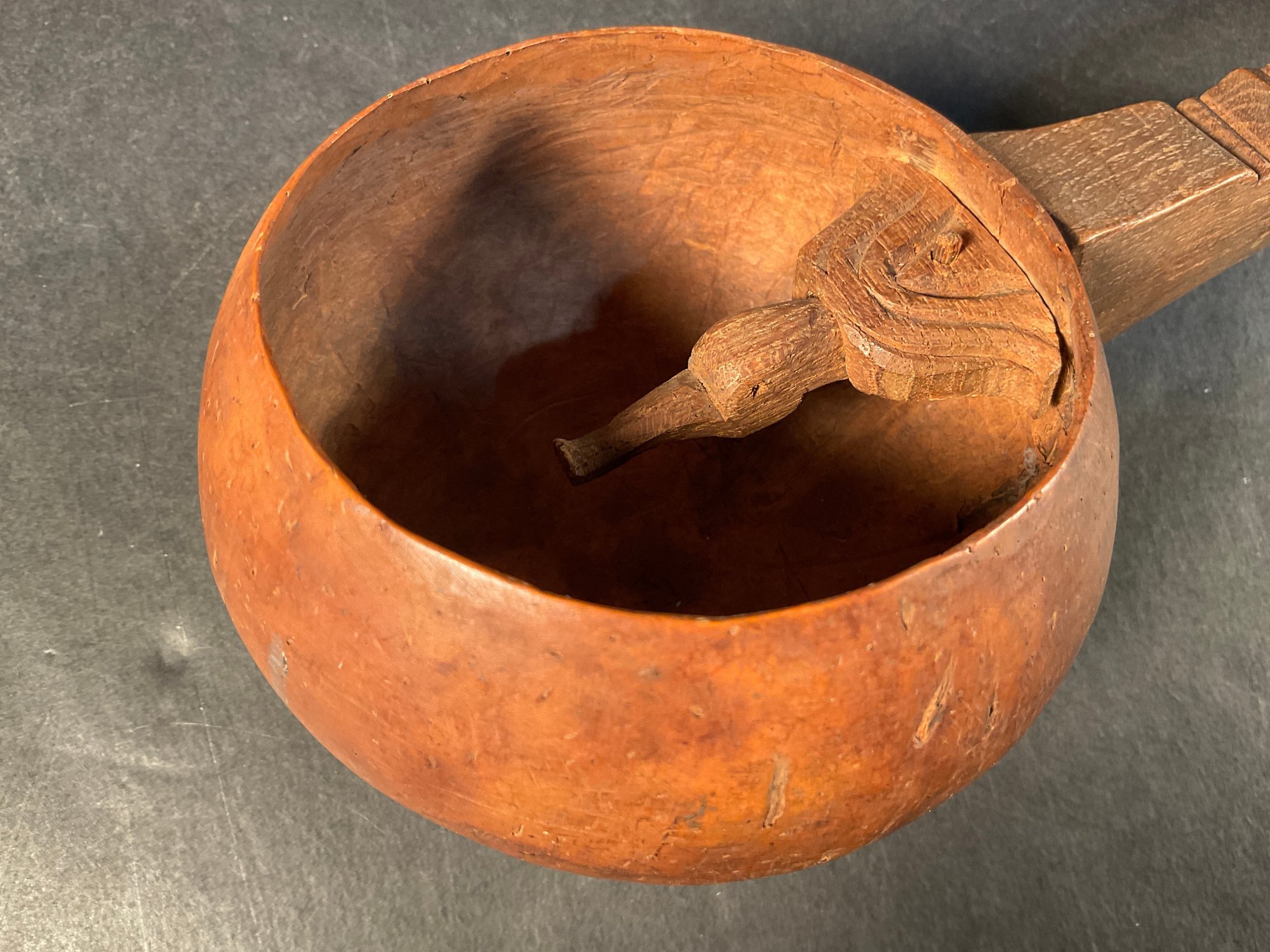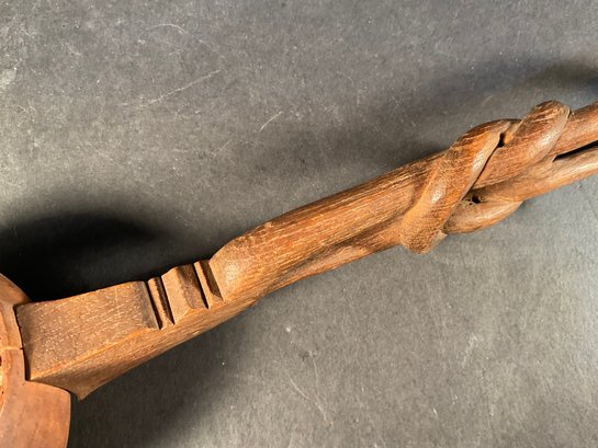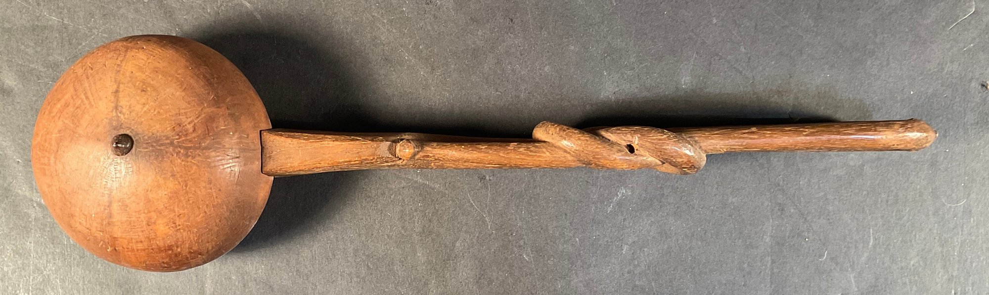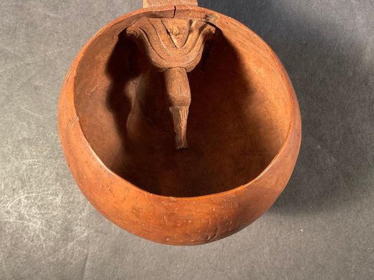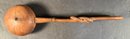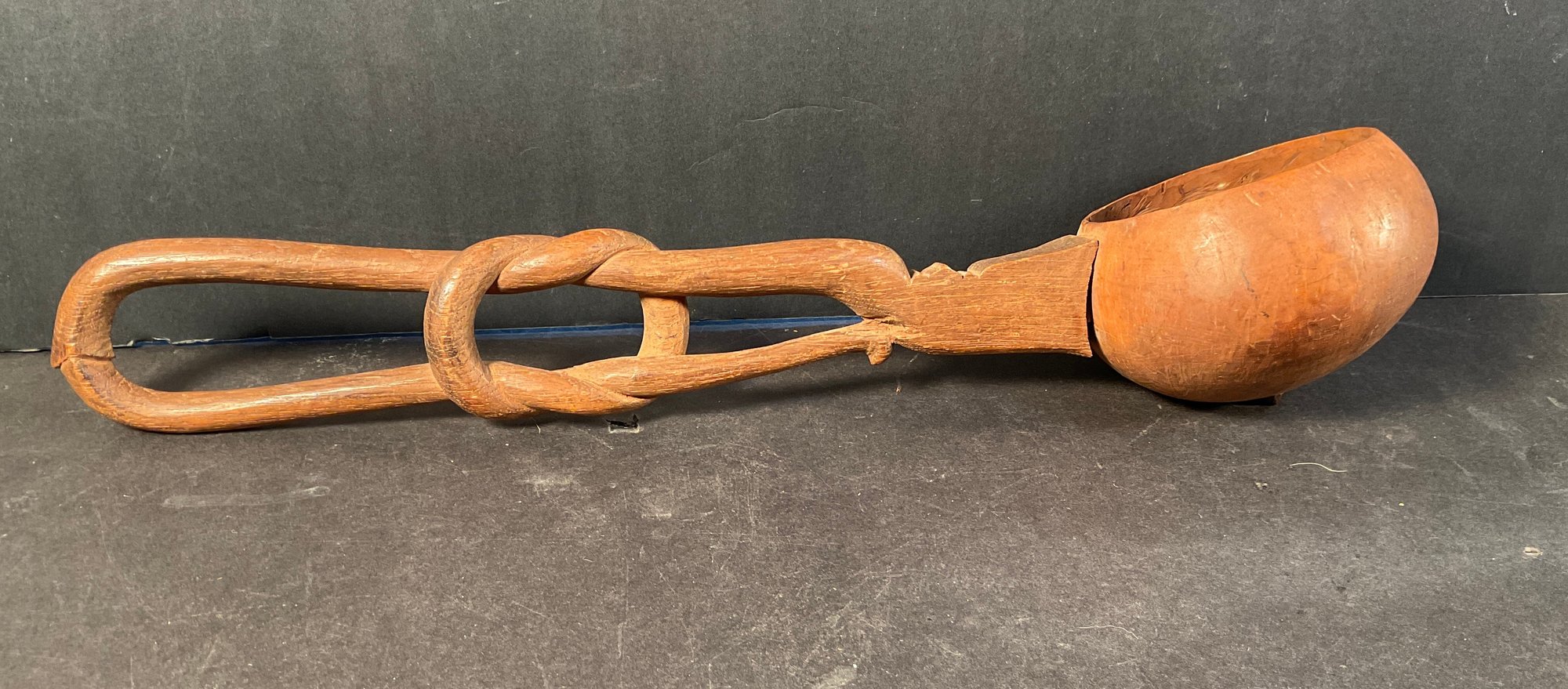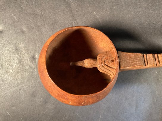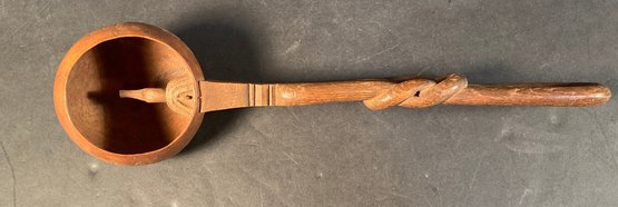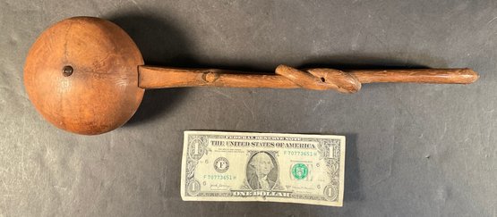 This hand carved ladle as a wonderful piece of folk cart with a carved bird and half hitch knot. The ball is a carved gourd. The handle is made of oak and there was no damage or replaced parts. All original nut brown finish. The Gourd will unattached. By pulling a wooden peg out of the stylized wings.