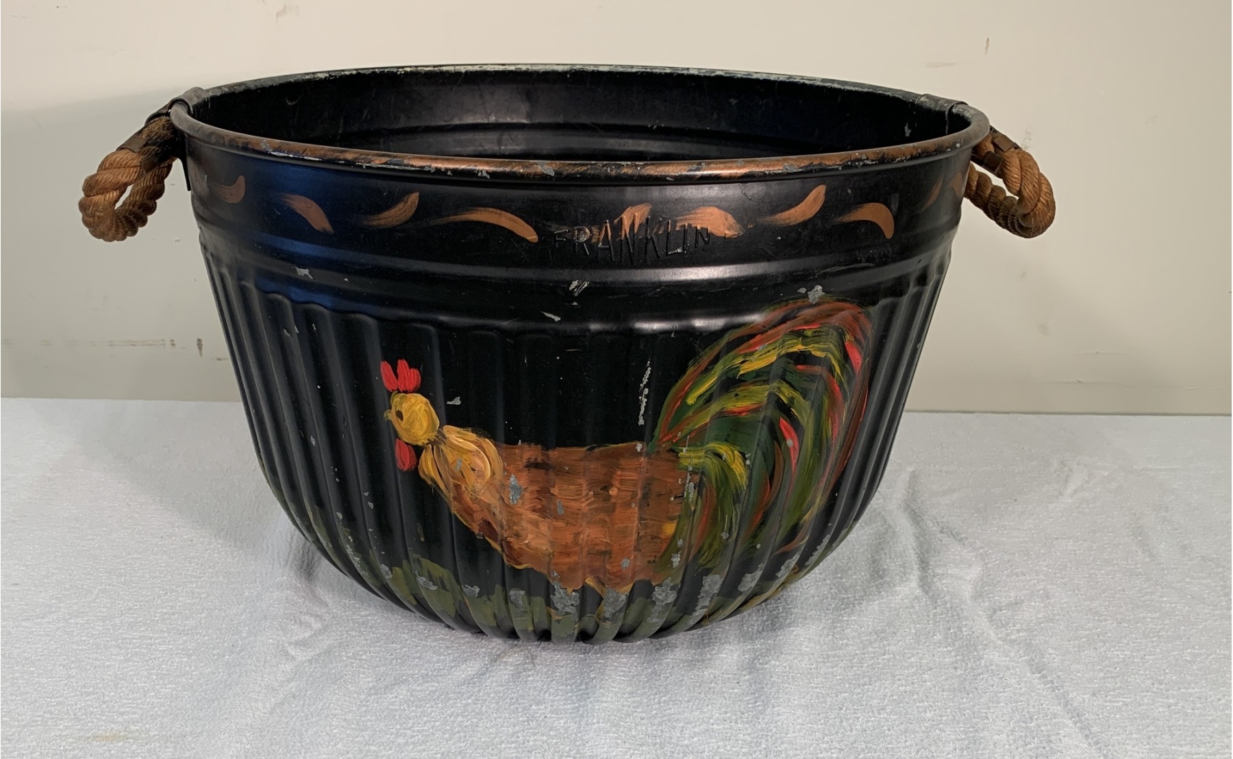 Hand painted both sides with a chicken. Copper and rope handles. All original, heavy duty ready to be used.
