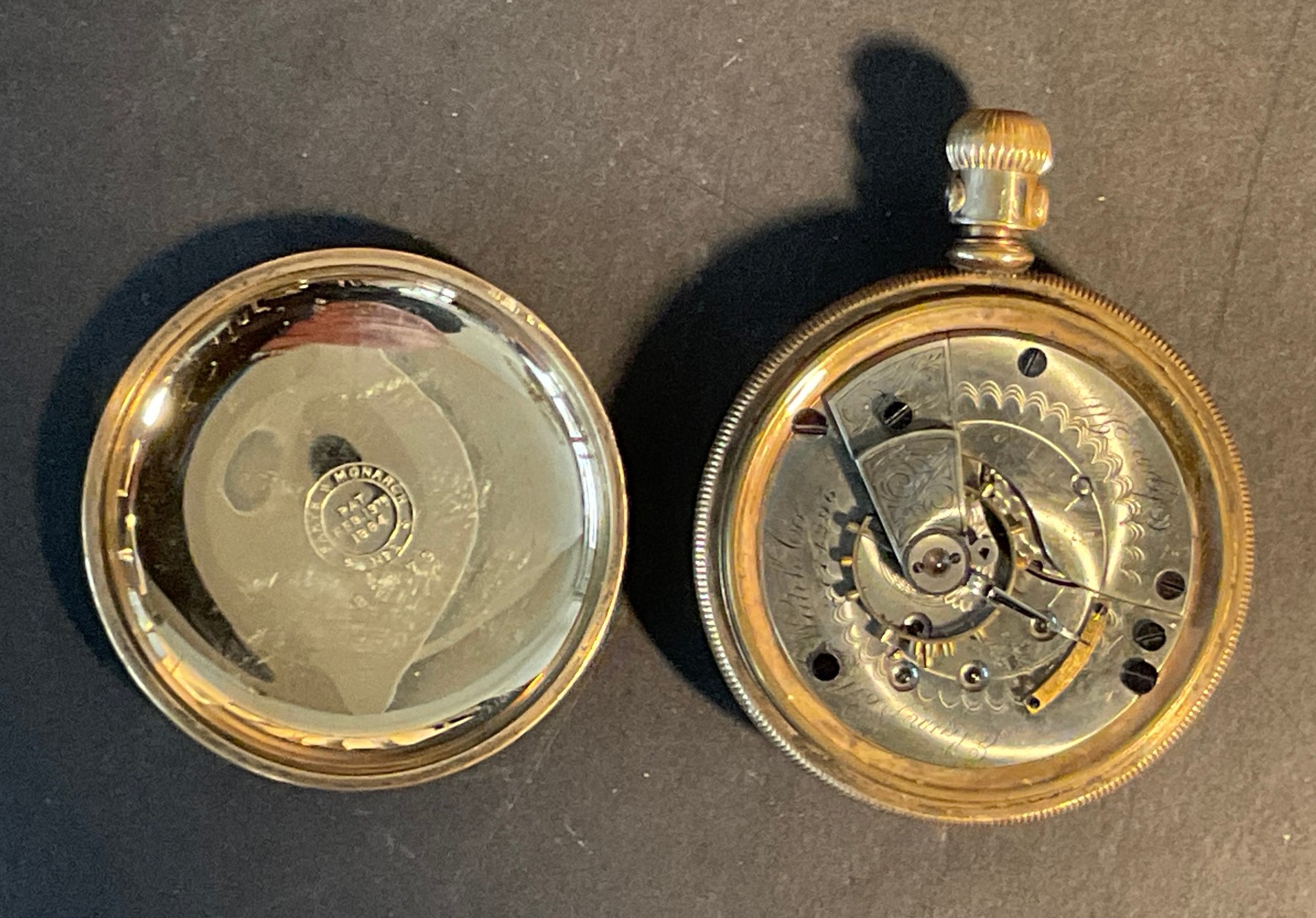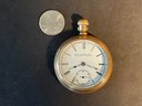 This goal filled men’s pocket watch is not running and is missing the bow. Everything else seems to be there. Look at the pictures closely for a complete description. This watch was found in a dresser drawer and probably has not been used in many years.