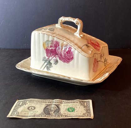 Here is an excellent antique covered cheese plate from Germany. It is in excellent condition, and is hand decorated with pink roses and green leaves.