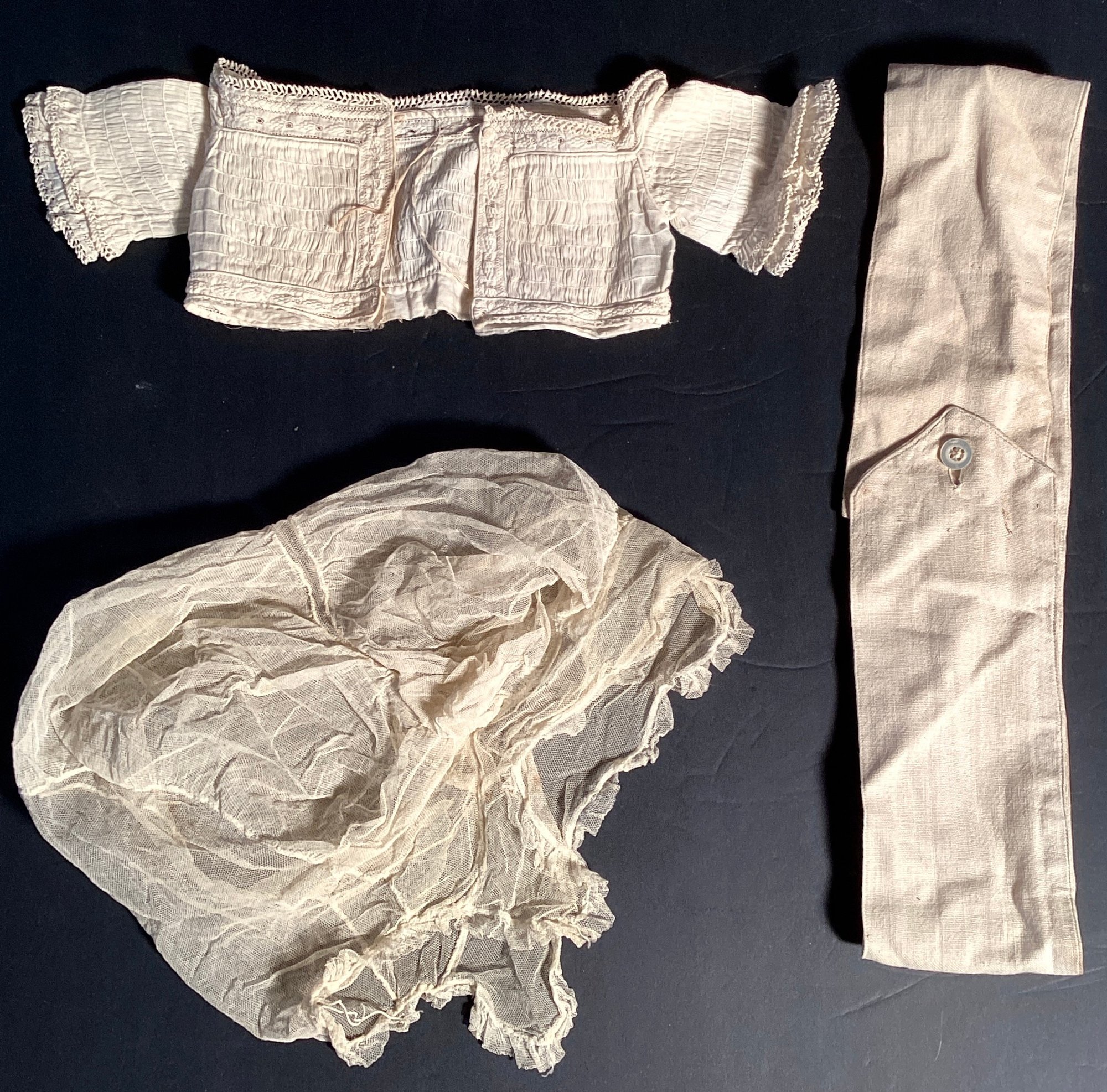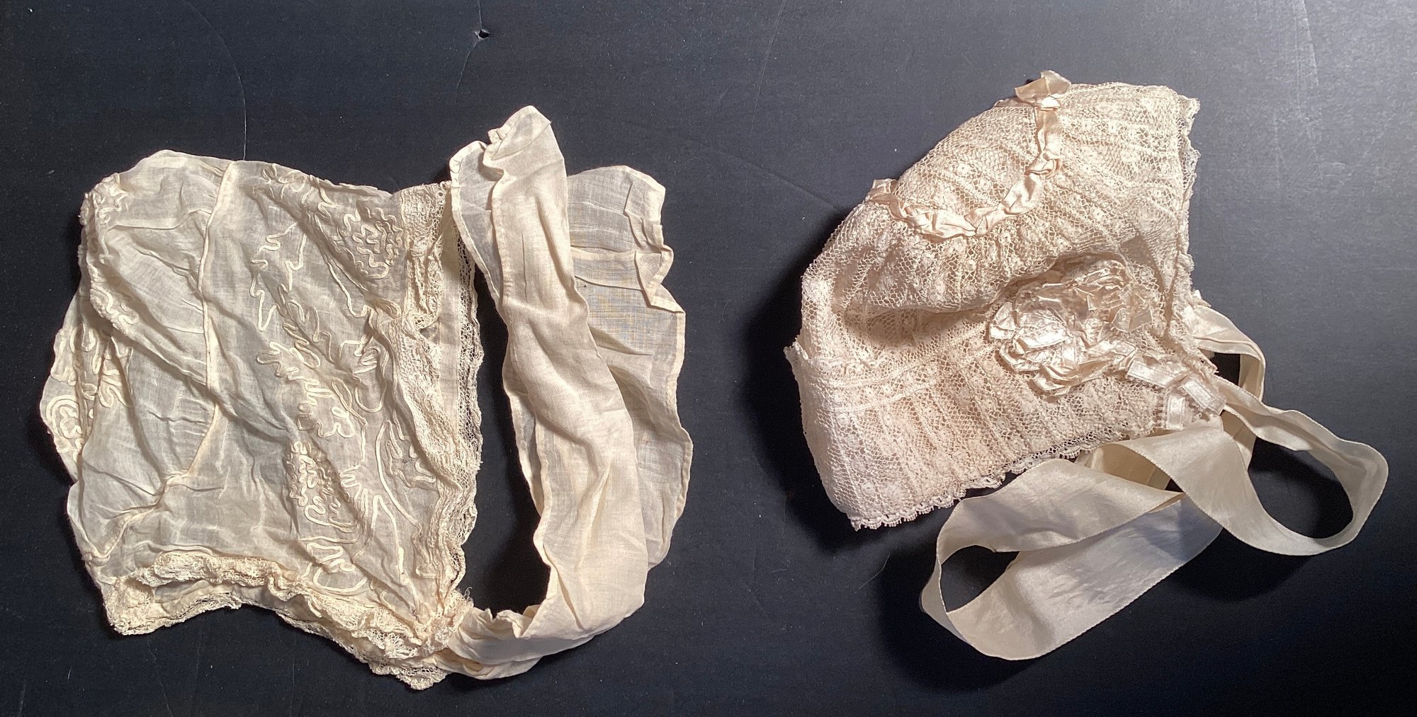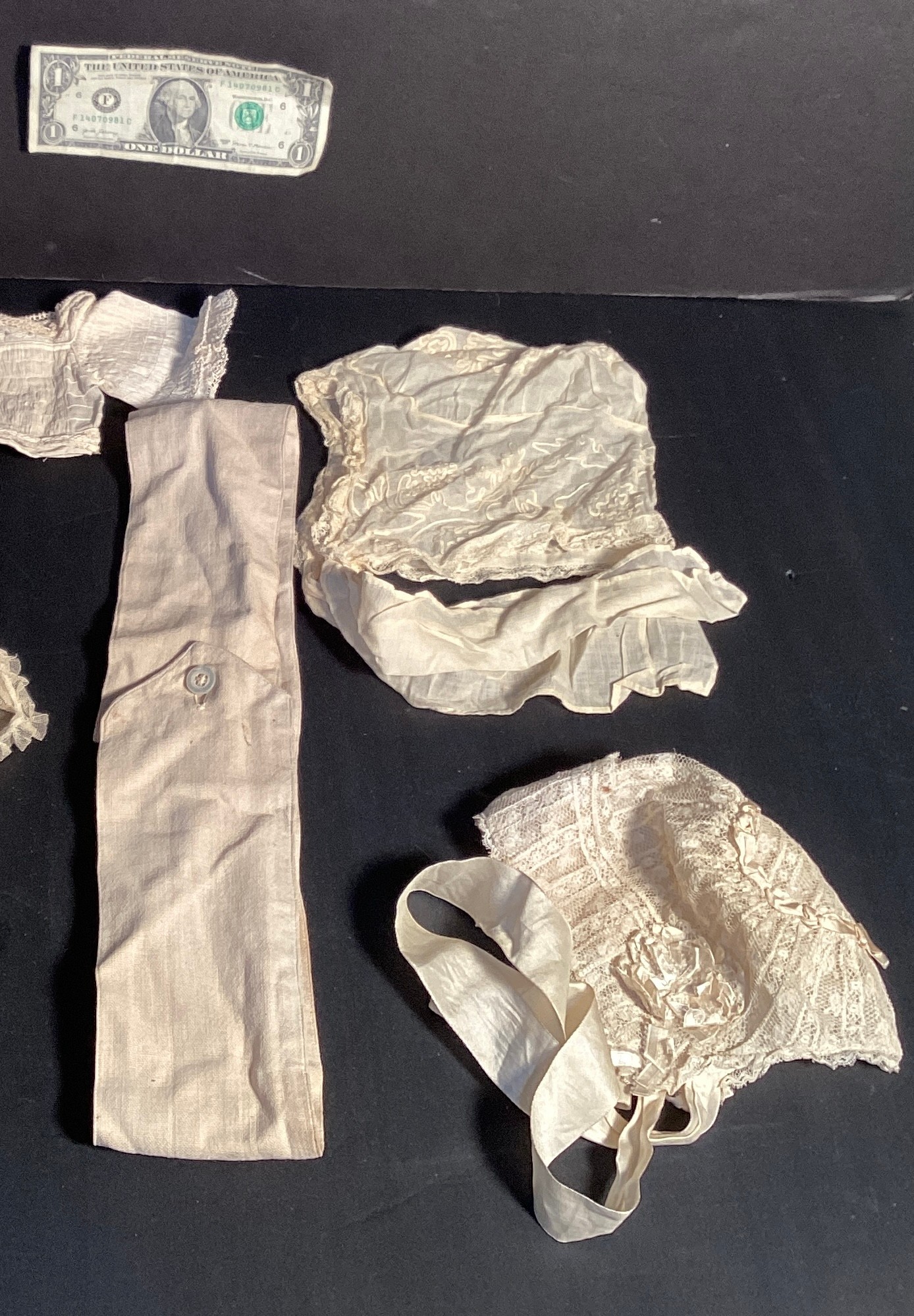 Here we have a nice grouping of 2 baby bonnets, a newborn top, a netted adult bonnet, and a linen belt.